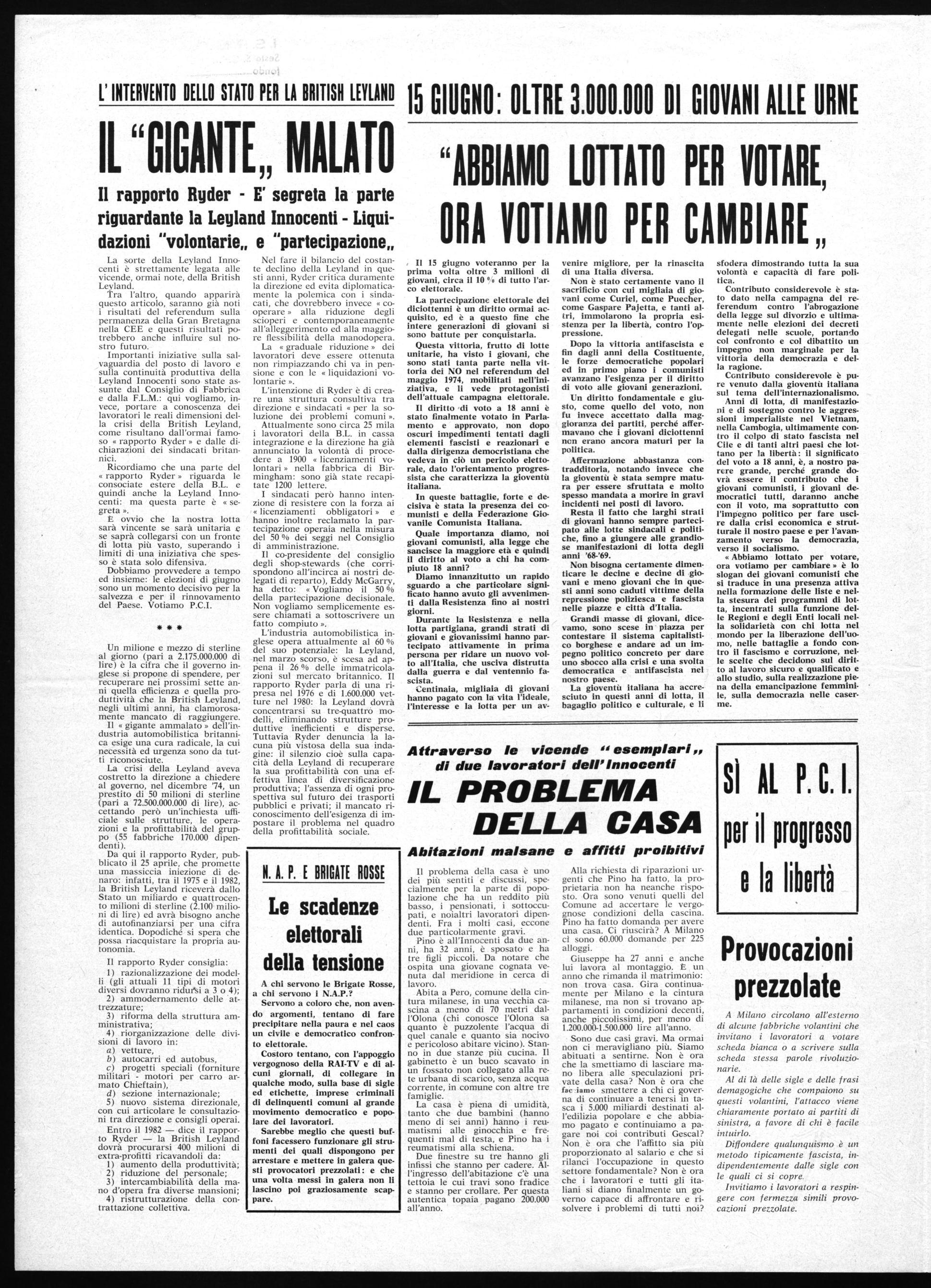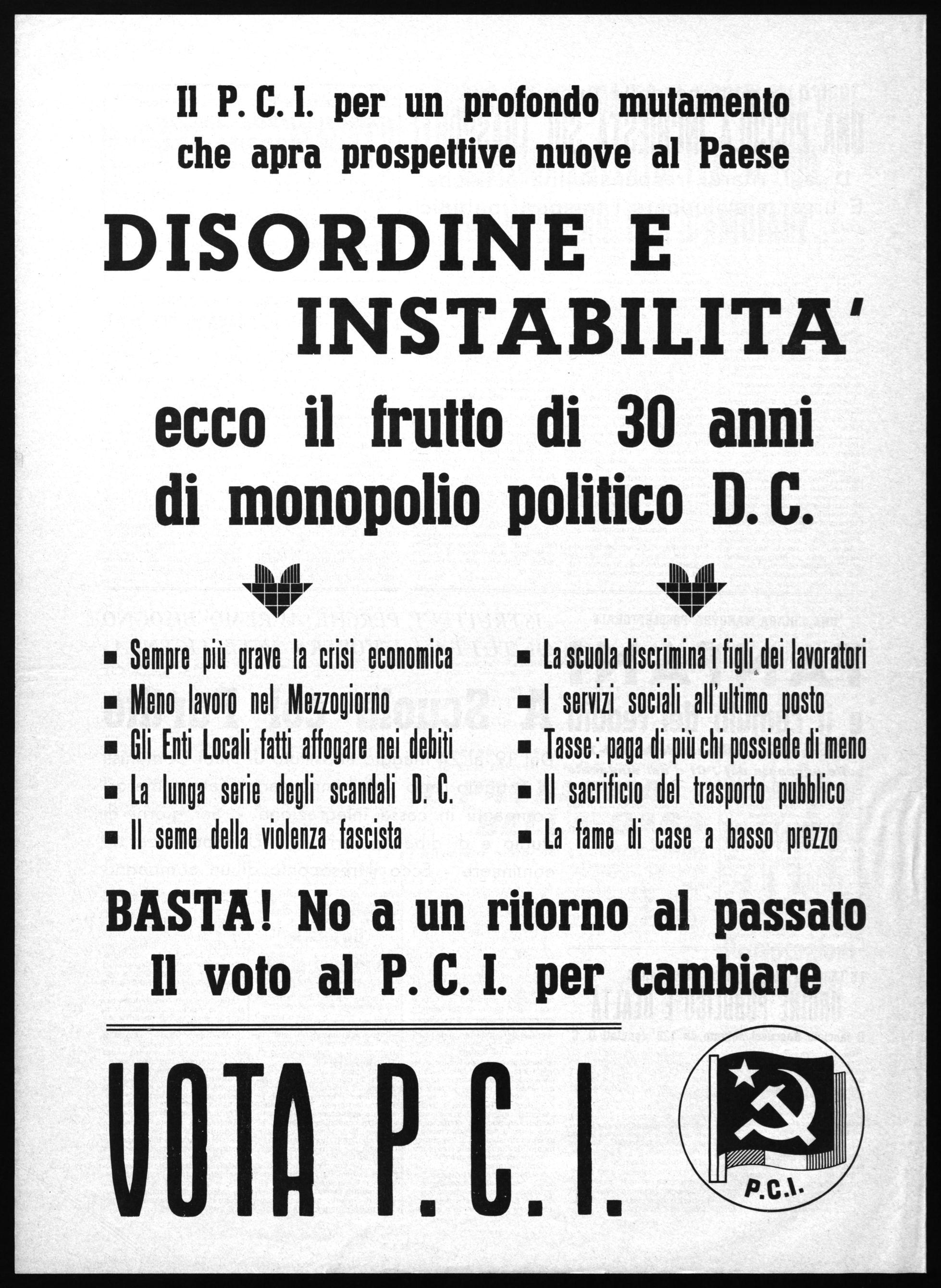 Chiediamo di votare P.C.I. ai lavoratori, ai cattolici, ai giovani che hanno davanti oggi una vita senza prospettive, a tutti coloro che veramente vogliono una società diversa, più giusta. Chiediamo di votare P.C.I. per costruire nel nostro paese una società nuova, una società socialista.