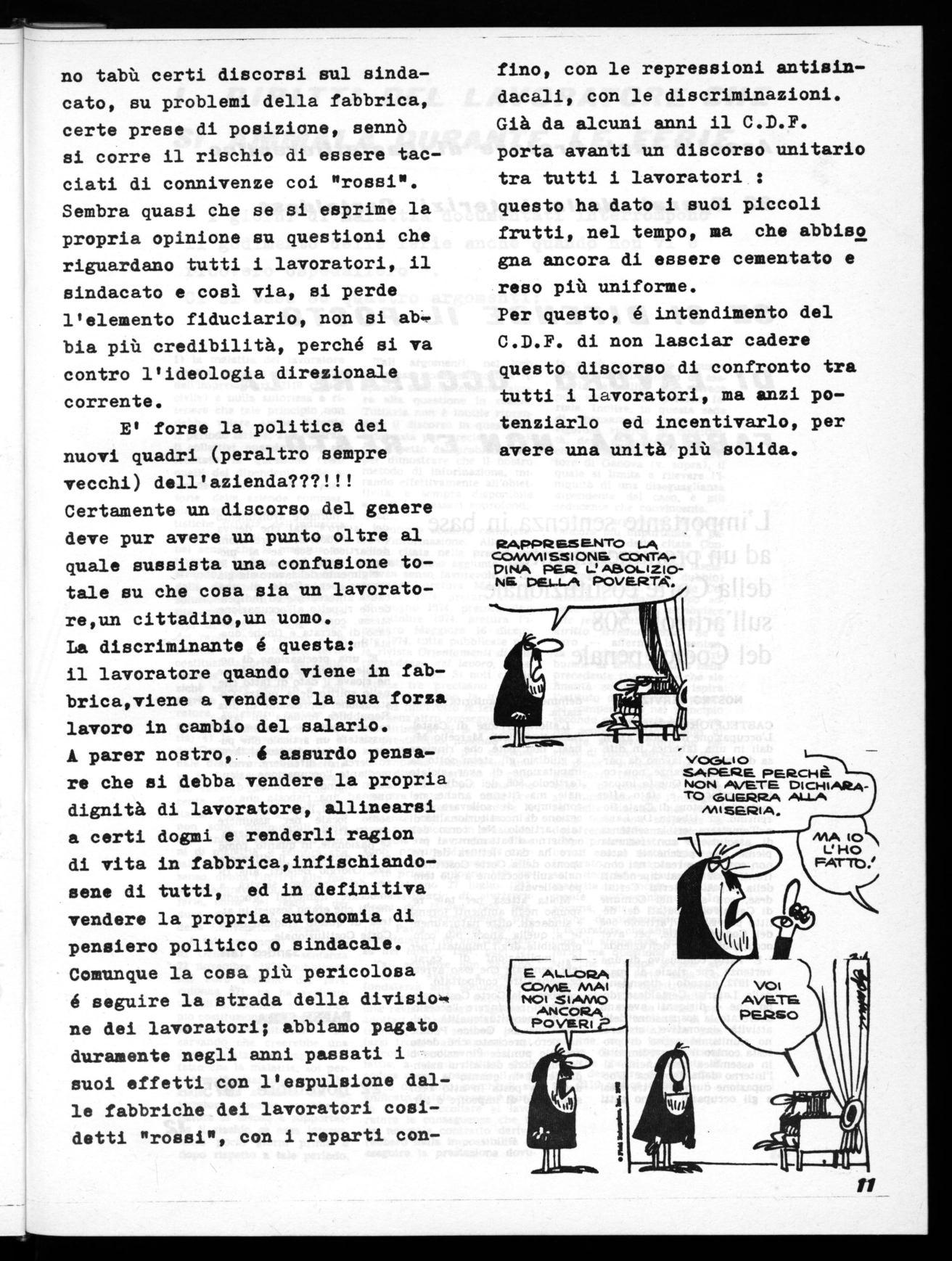 ga o col vicino di macchina,ma che restano patrimonio di pochi intimi senza essere socializzati e resi alla valutazione di tutti i lavora tori. Pertanto il giornalino da questo punto di vista diventa uno strumento di collegamento tra i la voratori ed il C.d.F.,ma soprattut to tra i lavoratori stessi.