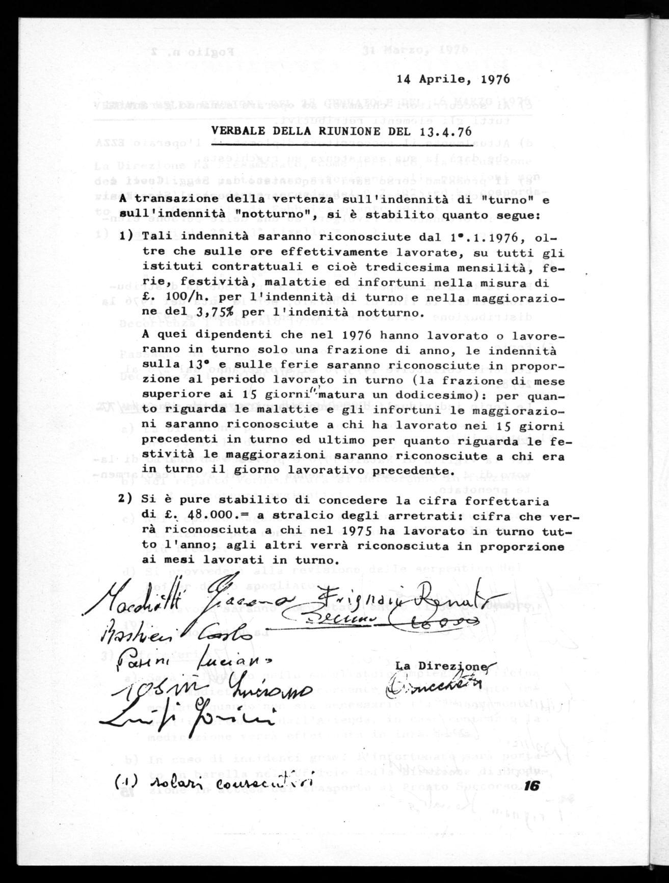 Si è pure stabilito di concedere la cifra forfettaria di £. 48.000.= a stralcio degli arretrati: cifra che verrà riconosciuta a chi nel 1975 ha lavorato in turno tutto l'anno; agli altri verrà riconosciuta in proporzione ai mesi lavorati in turno.