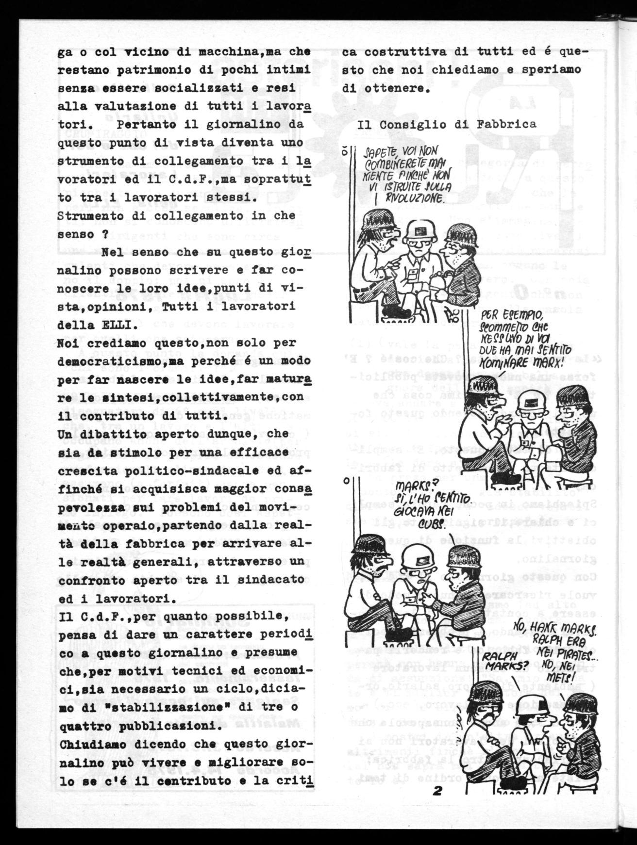 Con questo giornalino il C.d.F., vuole ricercare un nuovo modo di essere a contatto con i lavoratori,affrontando i problemi specifi ci della fabbrica e renderli patrimonio di ciascun lavoratore ( ambiente di lavoro,salario,organizzazione del lavoro, ecc.) .