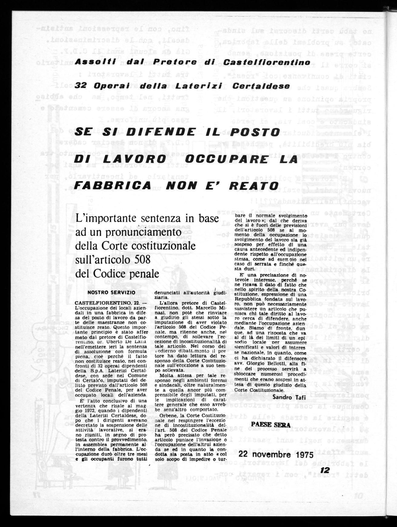 E' una precisazione di notevole Interesse, perché se ne ricava il dato di fatto che nello spirito della nostra Costituzione, espressione di una Repubblica fondata sul lavoro, non può necessariamente sussistere un articolo che punisca chi tale diritto al lavoro cerca di difendere. anche mediante l'occupazione azien date. SIAMO di fronte, dun que. ad una risposta che va ai di là dei limiti di un epi sodio locale ner assumere sienificati e valori di triteres se nazionale, In quanto, come ci ha dichiarato li difensore avv. Giorgio Bellotti, alla fine del processo servirà a sbloccare numerosi procedimenti che erano sospesi in attesa di questo giudizio della Corte Costituzionale.