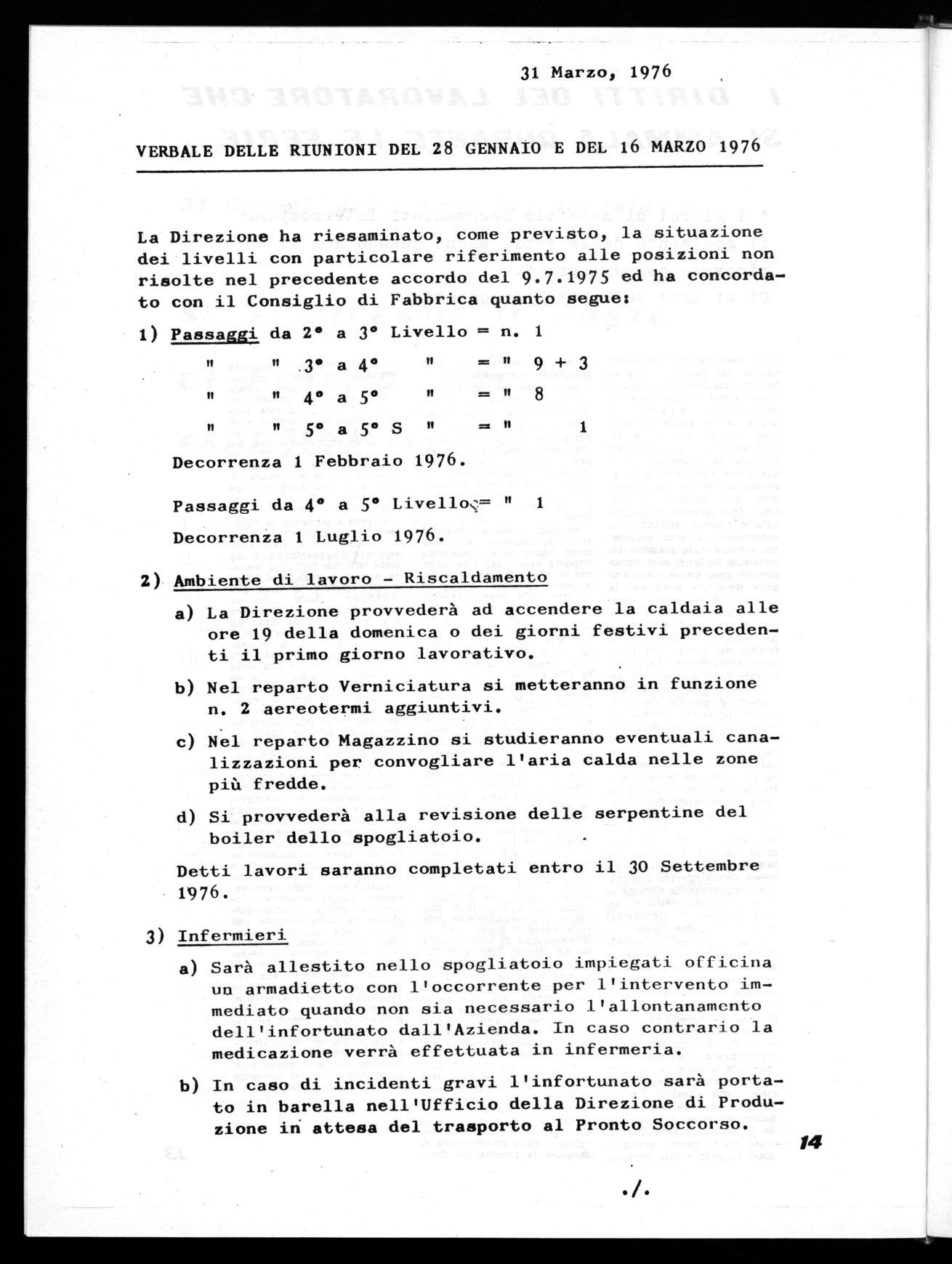 La Direzione ha riesaminato, come previsto, la situazione dei livelli con particolare riferimento alle posizioni non risolte nel precedente accordo del 9.7.1975 ed ha concordato con il Consiglio di Fabbrica quanto segue: