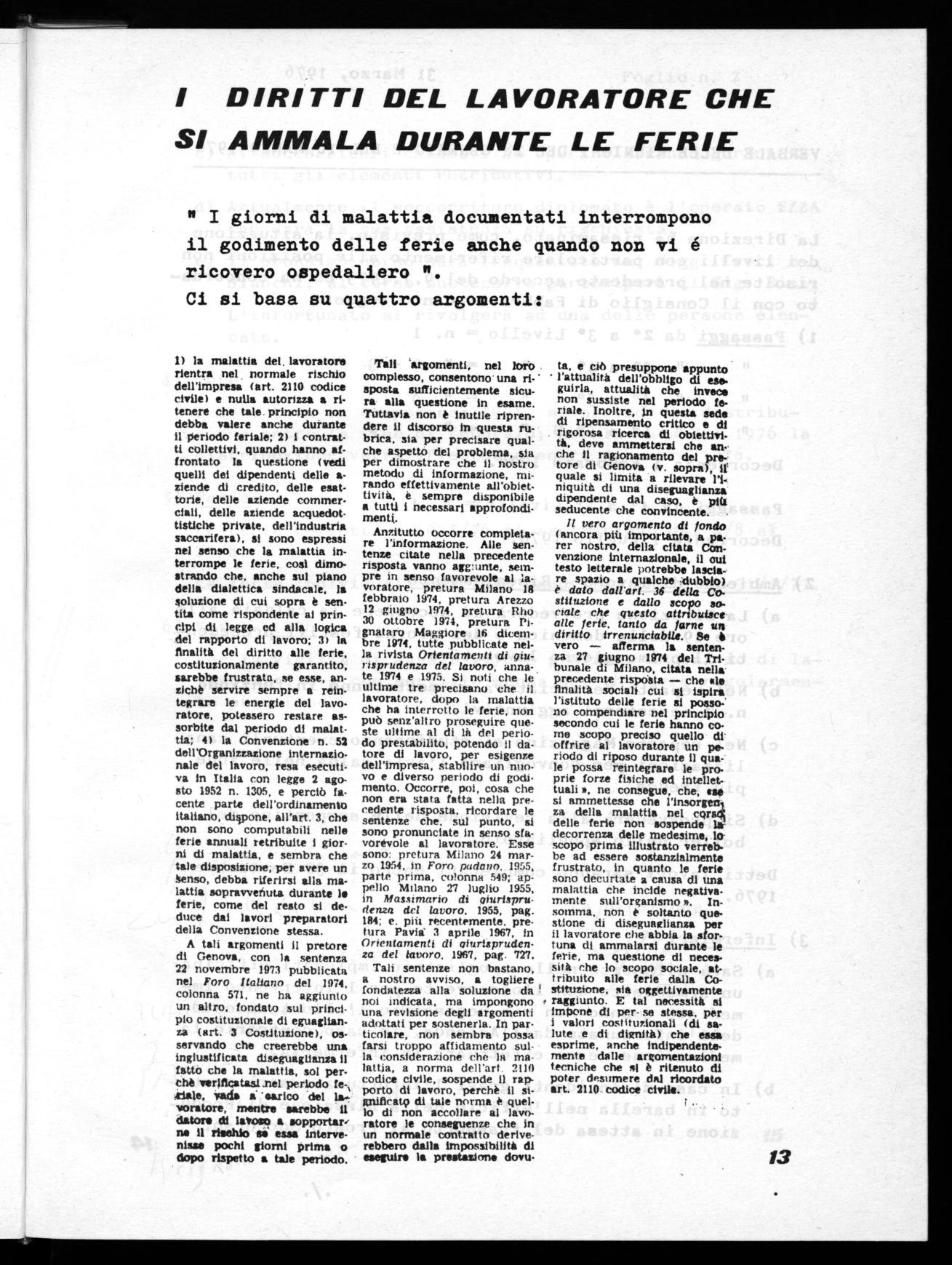 Il vero argomento dl fondo (ancora più importante, a parer nostro, della citata Convenzione internazionale, il cui testo letterale potrebbe lasciare spazio a qualche :dubbio) e dato danari. 36 della Costituzione e dallo scopo sociale che questo attribuisce alle ferie, tanto da farne un diritto Irrenunciabile. Se è vero — afferma la sentenza 27 giugno 1974 del Tribunale di Milano, citata nella precedente rispotta — che *le finalità sociali cui si ispira l'istituto delle ferie al passo; no compendiare nel principio secondo cui le ferie hanno come scopo preciso quello di' offrire al lavoratore un periodo dl riposo durante il qua- le possa reintegrare le proprie forze fisiche ed intellettuali a, ne consegue, che, inse si ammettesse che l'insorgen1 za della malattia nel corse5 delle ferie non sospende la decorrenza delle medesime,.1(4 scopo prima Illustrato verrebbe ad essere sostanzialmente frustrato, in quanto le ferie sono decurtate a causa dl una malattia che incide negativamente sull'organismo n. Insomma, non è soltanto que- stione di diseguaglianza per il lavoratore che abbia la sfortuna dl ammalarsi durante le ferie, ma questione di necessità che lo scopo sociale, attribuito alle ferie dalla Co! stittizione, sia oggettivamente raggiunto. E tal necessità ai impone di per- se stessa. per i valori costituzionali (dl salute e di dignità) che essa esprime, anche indipendentemente dalle argomentazioni tecniche che sl è ritenuto di poter desumere dal ricordato art. 2110 codice civile.