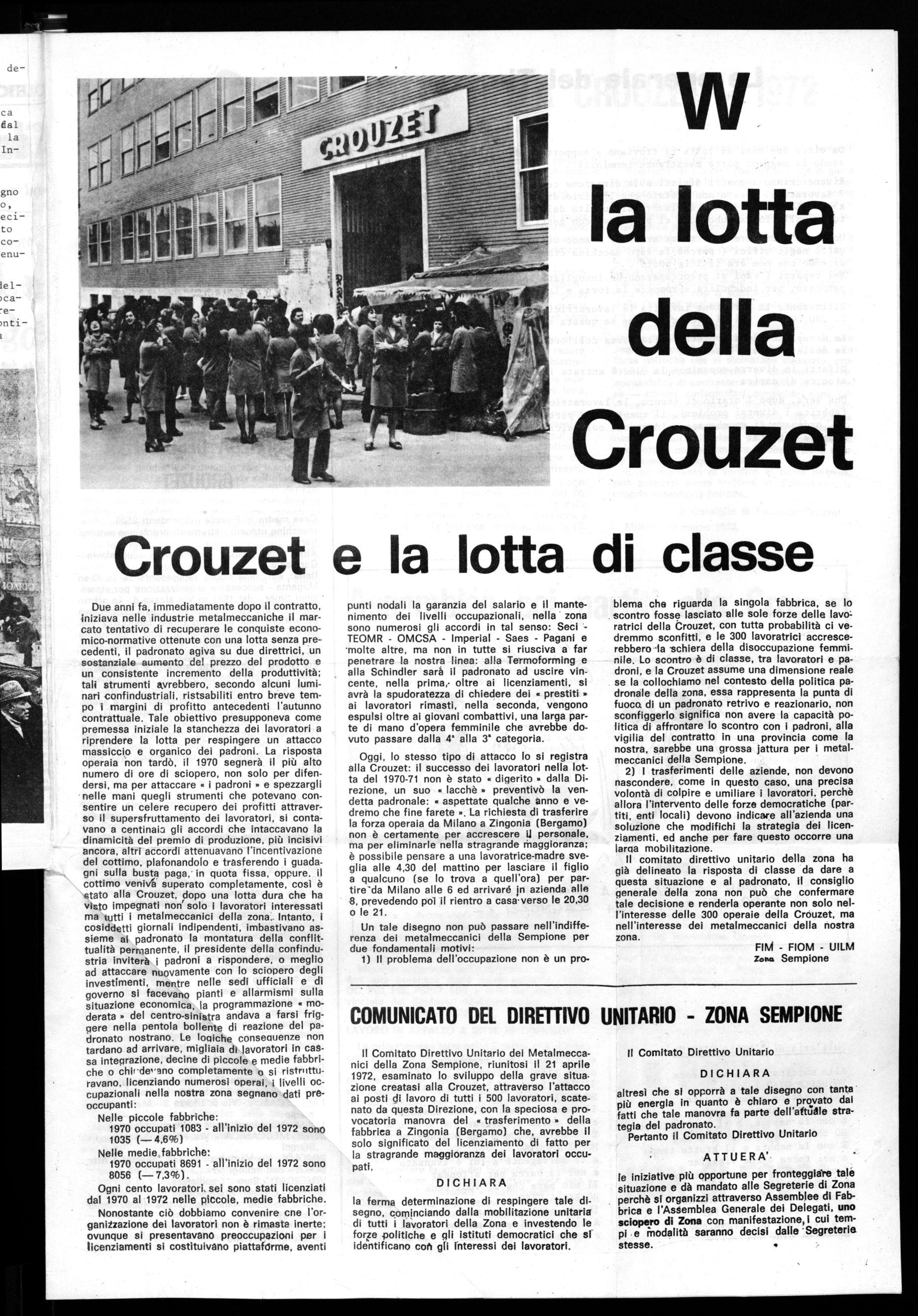 Le forze politiche convenute all'Assemblea dei lavoratori della CROUZET, nell'assumere la loro piena solidarietà ai lavoratori in lotta contro l'ingiustificato tentativo di trasferimento dello stabilimento a Zingonia (Bergamo) (tentativo che rileva sempre più il suo carattere punitivo nei confronti delle maestranze e che solleva dubbi circa la reale volontà dell'azienda di procedere alla proclamata espansione dell'attività produttiva) DECIDONO: di effettuare un intervento comune ed immediato presso il Sindaco e la Commissionali comunali competenti, affinchè il Comune offra al possibilità all'azienda di utilizzare suoli liberi nel territorio della Zona 20 per l'impianto su di essi del nuovo stabilimento, promuovendo un immediato esproprio di aree edificabili destinate a zona industriale nel vigente PRG; di effettuare analogo passo, presso la Regione affinchè il Governo regionale usi le proprie possibilità -di intervento; di effettuare un intervento presso il questore e il Procuratore della Repubblica, perchè cessi la intimidatoria presenza della polizia nei pressi della fabbrica che rappresenta una oggettiva e permanente provocazione.