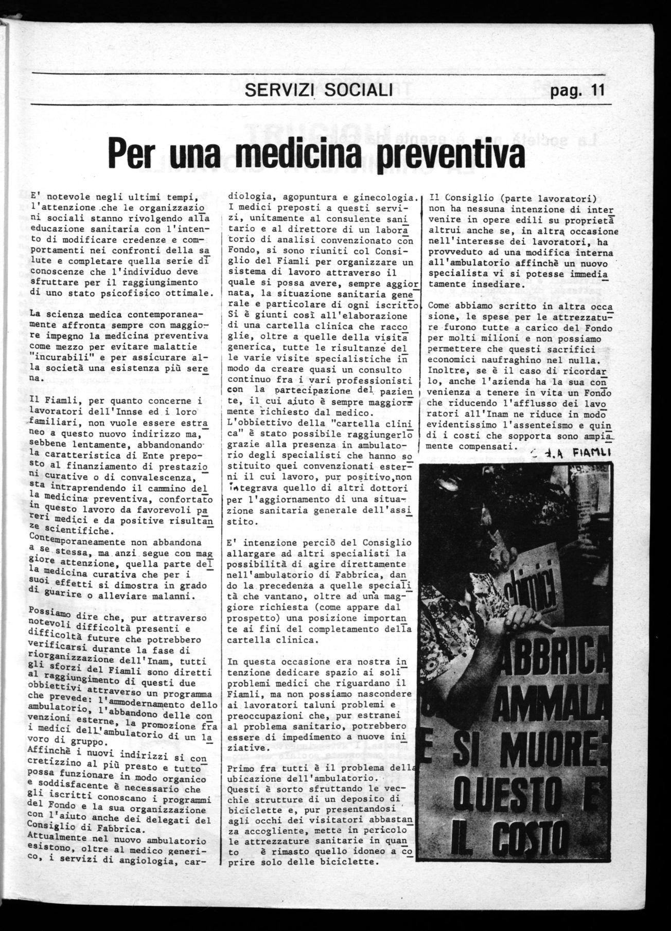 Il Fiamli, per quanto concerne i lavoratori dell'Innse ed i loro familiari, non vuole essere estra neo a questo nuovo indirizzo ma, sebbene lentamente, abbandonandola caratteristica di Ente preposto al finanziamento di prestazio ni curative o di convalescenza, sta intraprendendo il cammino del la . medicina preventiva, confortato In questo lavoro da favorevoli pa reti medici e da positive risultan ze scientifiche.