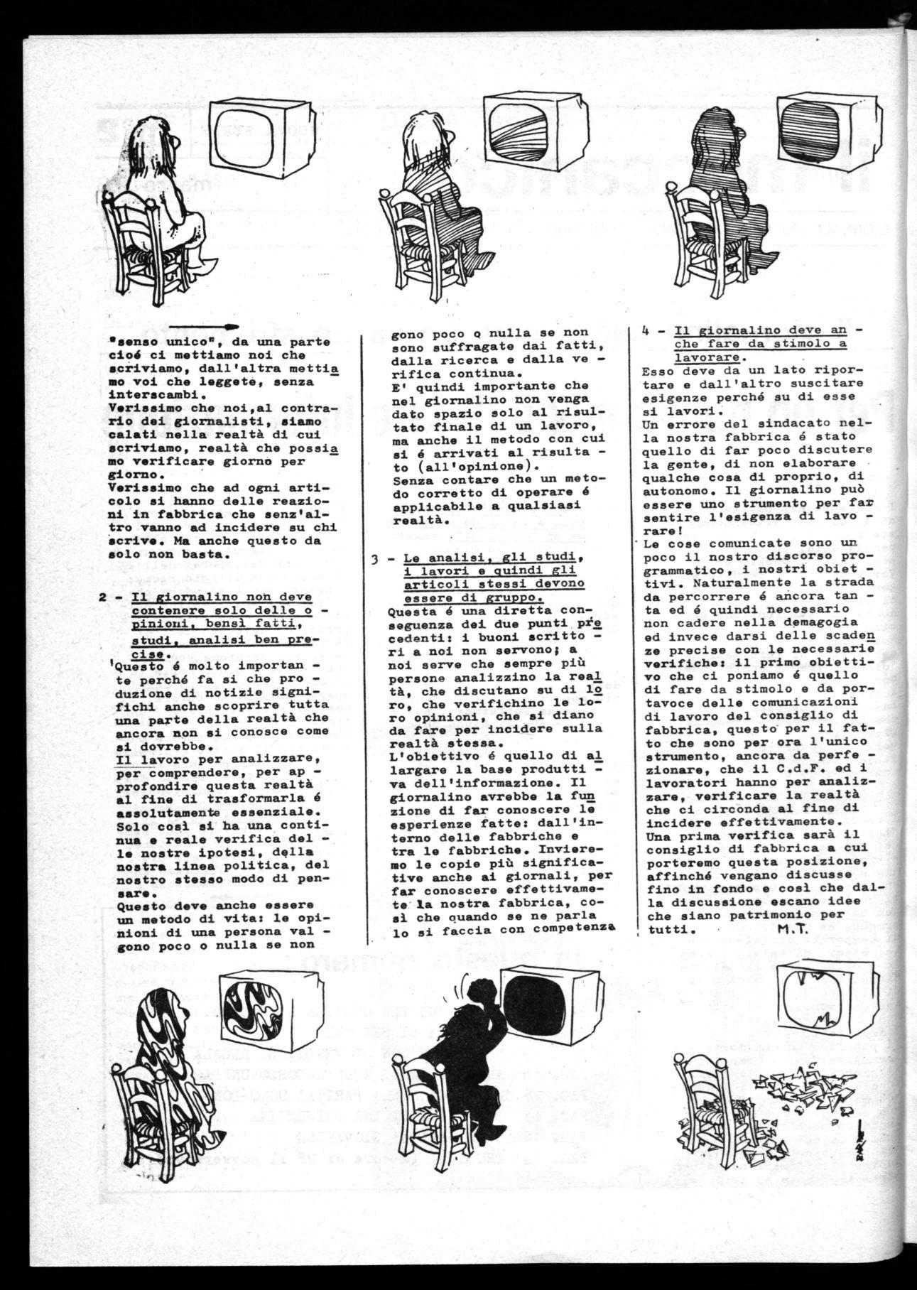 L'obiettivo é quello di al largare la base produttiva dell'informazione. Il giornalino avrebbe la fun zione di far conoscere le esperienze fatte: dall'interno delle fabbriche e tra le fabbriche. Invieremo le copie più significative anche ai giornali, per far conoscere effettivamete la nostra fabbrica, così che quando se ne parla lo si faccia con competenza
