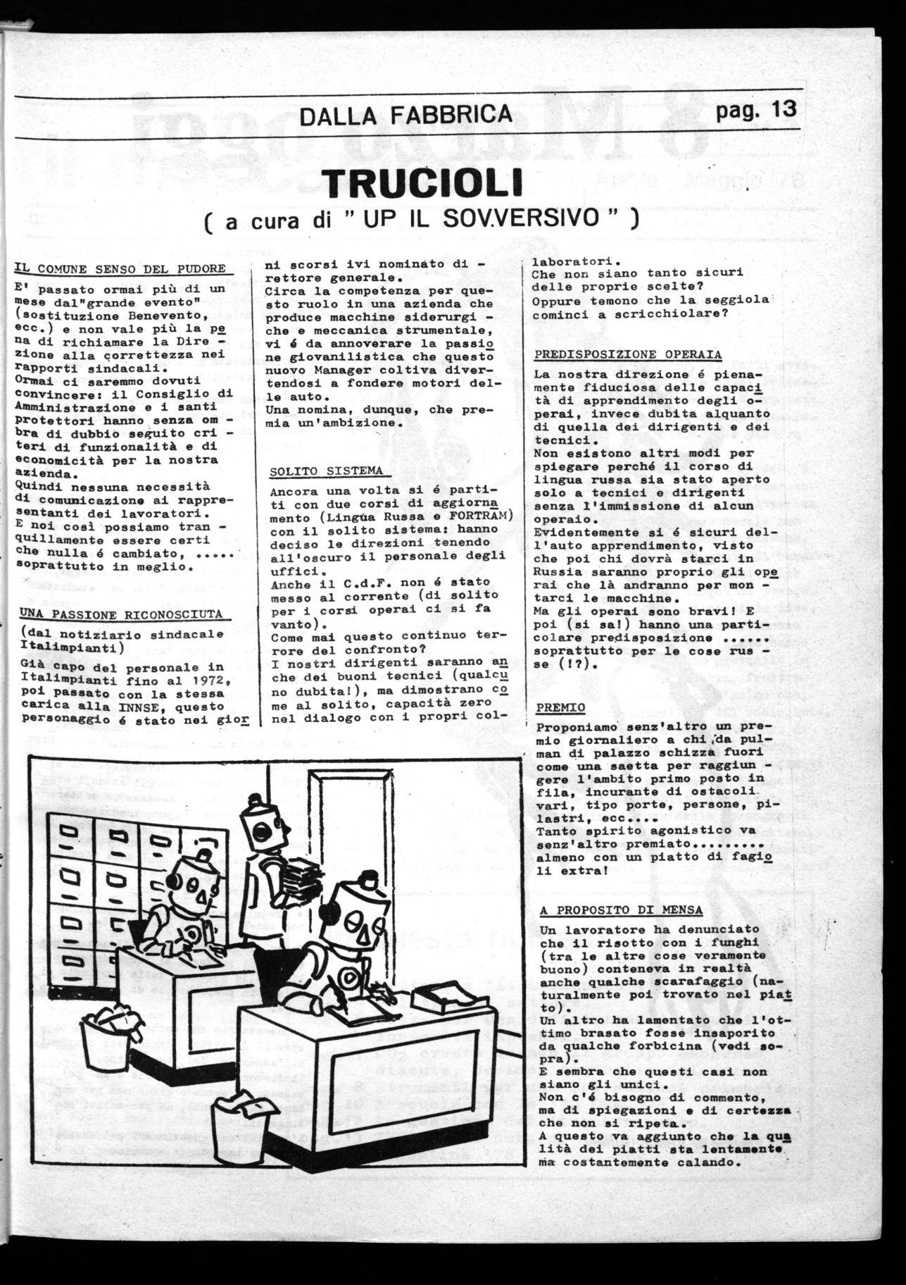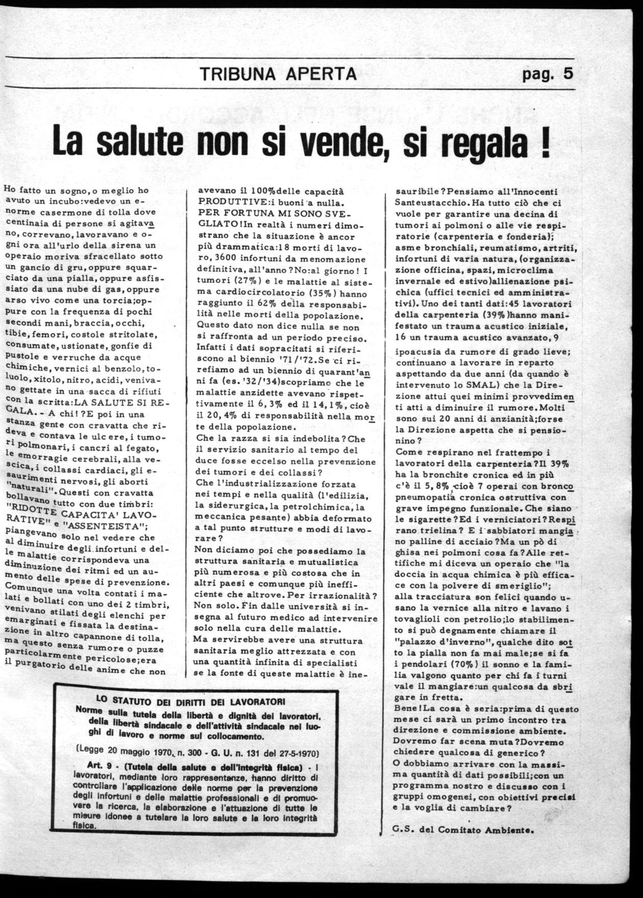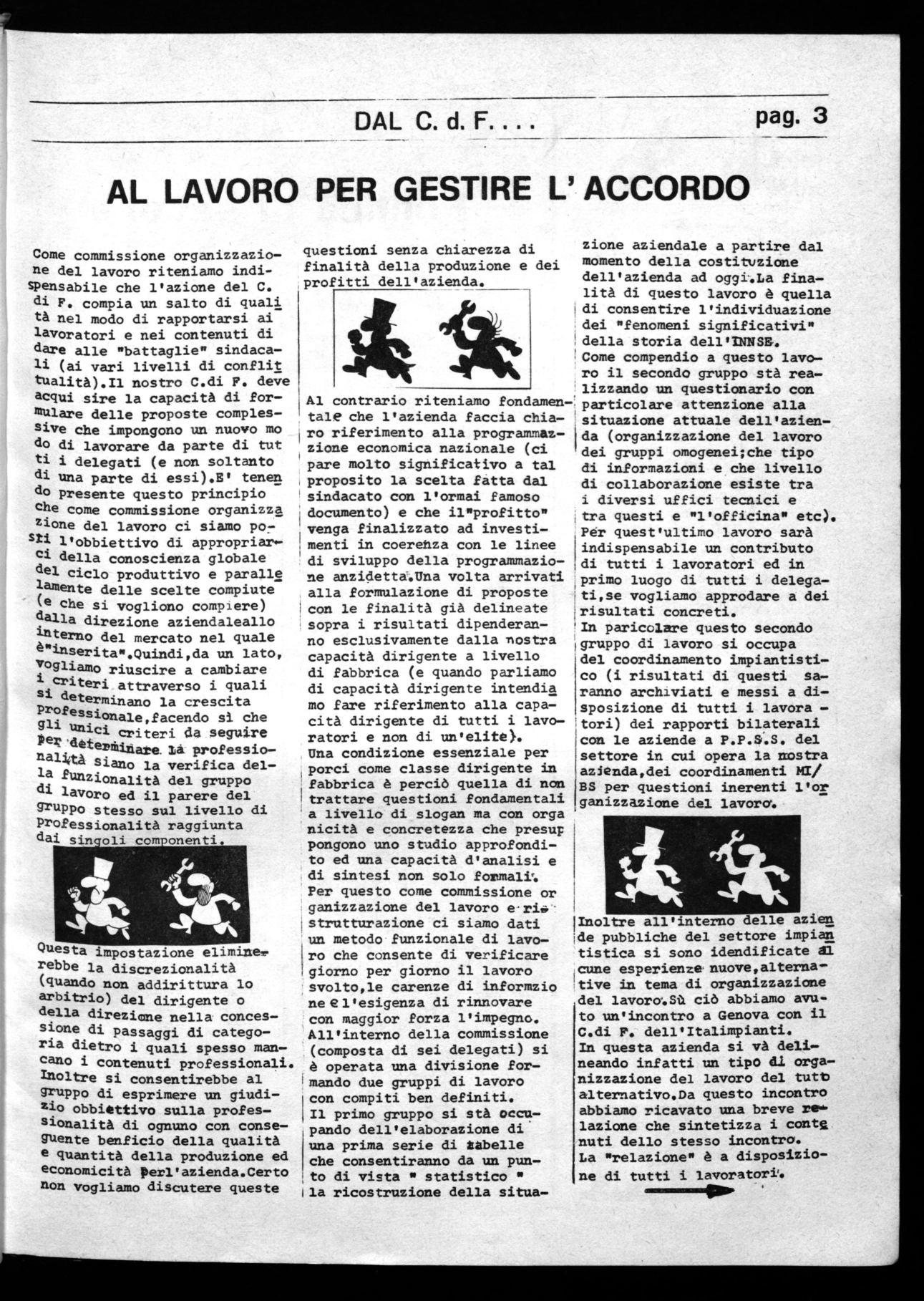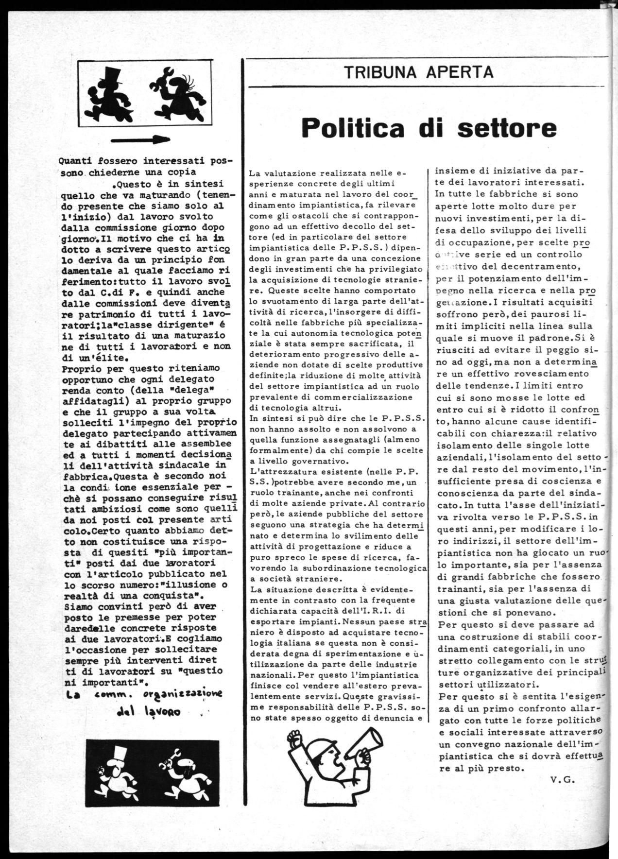 Le cose comunicate sono un poco il nostro discorso programmatico, i nostri obiettivi. Naturalmente la strada da percorrere é ancora tanta ed é quindi necessario non cadere nella demagogia ed invece darsi delle scaden ze precise con le necessarie verifiche: il primo obiettivo che ci poniamo é quello di fare da stimolo e da portavoce delle comunicazioni di lavoro del consiglio di fabbrica, questo per il fatto che sono per ora l'unico strumento, ancora da perfezionare, che il C.d.F. ed i lavoratori hanno per analizzare, verificare la realtà che ci circonda al fine di incidere effettivamente. Una prima verifica sarà il consiglio di fabbrica a cui porteremo questa posizione, affinché vengano discusse fino in fondo e così che dalla discussione escano idee che siano patrimonio per tutti.