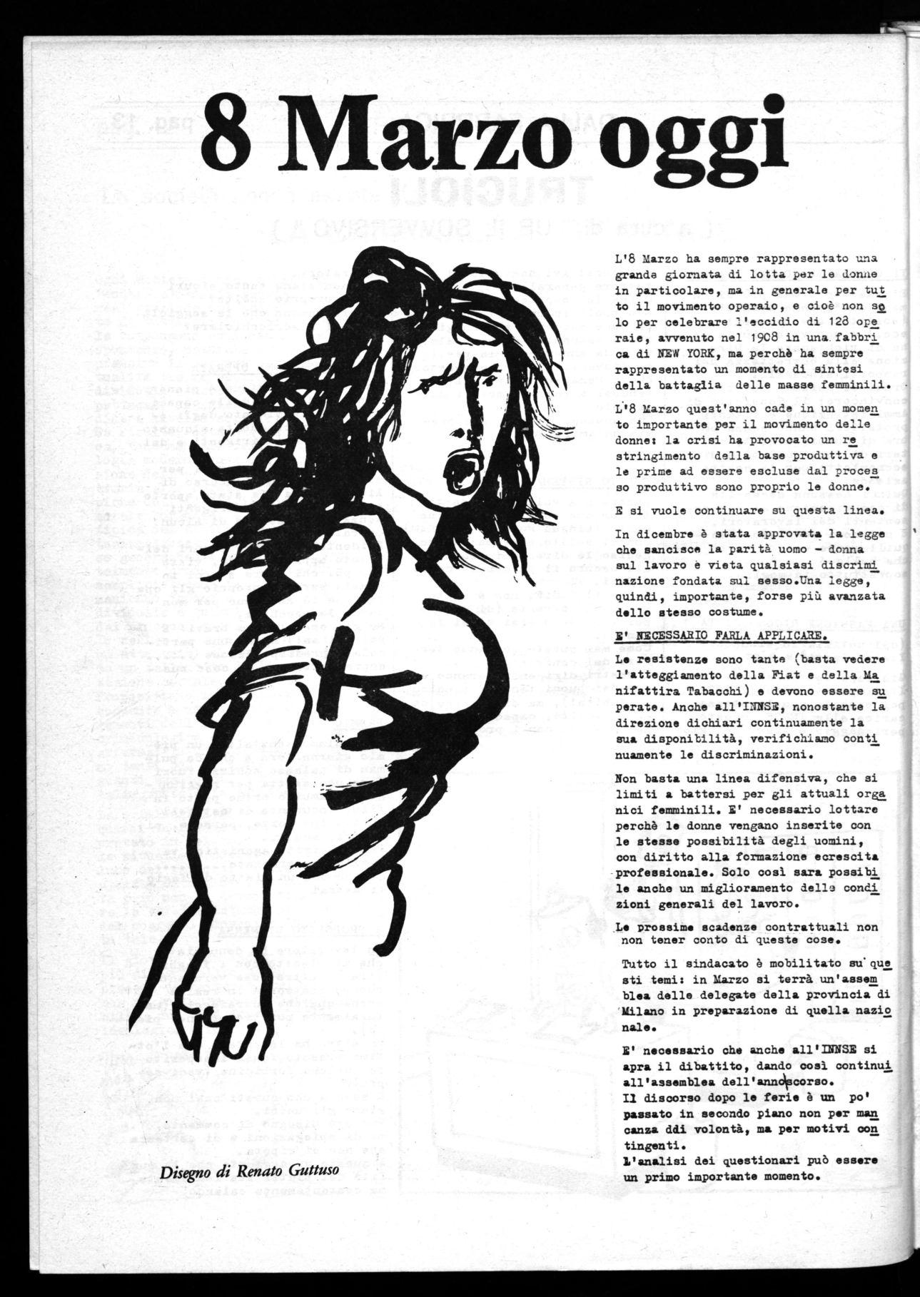 L'8 Marzo ha sempre rappresentato una • grande giornata di lotta per le donhe in particolare, ma in generale per tut to il movimento operaio, e cioè non se lo per celebrare .'eccidio di 128 ope raie, avvenuto nel 1908 in una fabbr7 ca di NEW YORK, ma perchè ha sempre rappresentato un momento di sintesi della battaglia delle masse femminili. Marzo quest'anno cade in un momen to importante per il movimento delle donne: la crisi ha provocato un re stringimento della base produttiva e le prime ad essere escluse dal proces so produttivo sono proprio le donne.