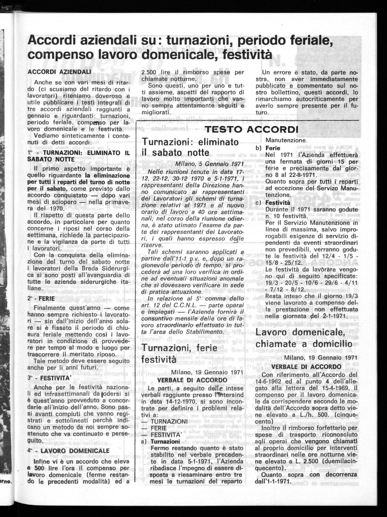 L'accordo raigunto riteniamo che sia il più importante e sostanziale `accordo aziendale raggiunto alla Breda Siderurgica da quando attuiamo la contrattazione articolata, ma ciò non significa che tutti i problemi posti siano stati risolti, ci riferiamo in particolare alla gratifica di bilancio (o pasquale) ed al valore dell'accantonamento.