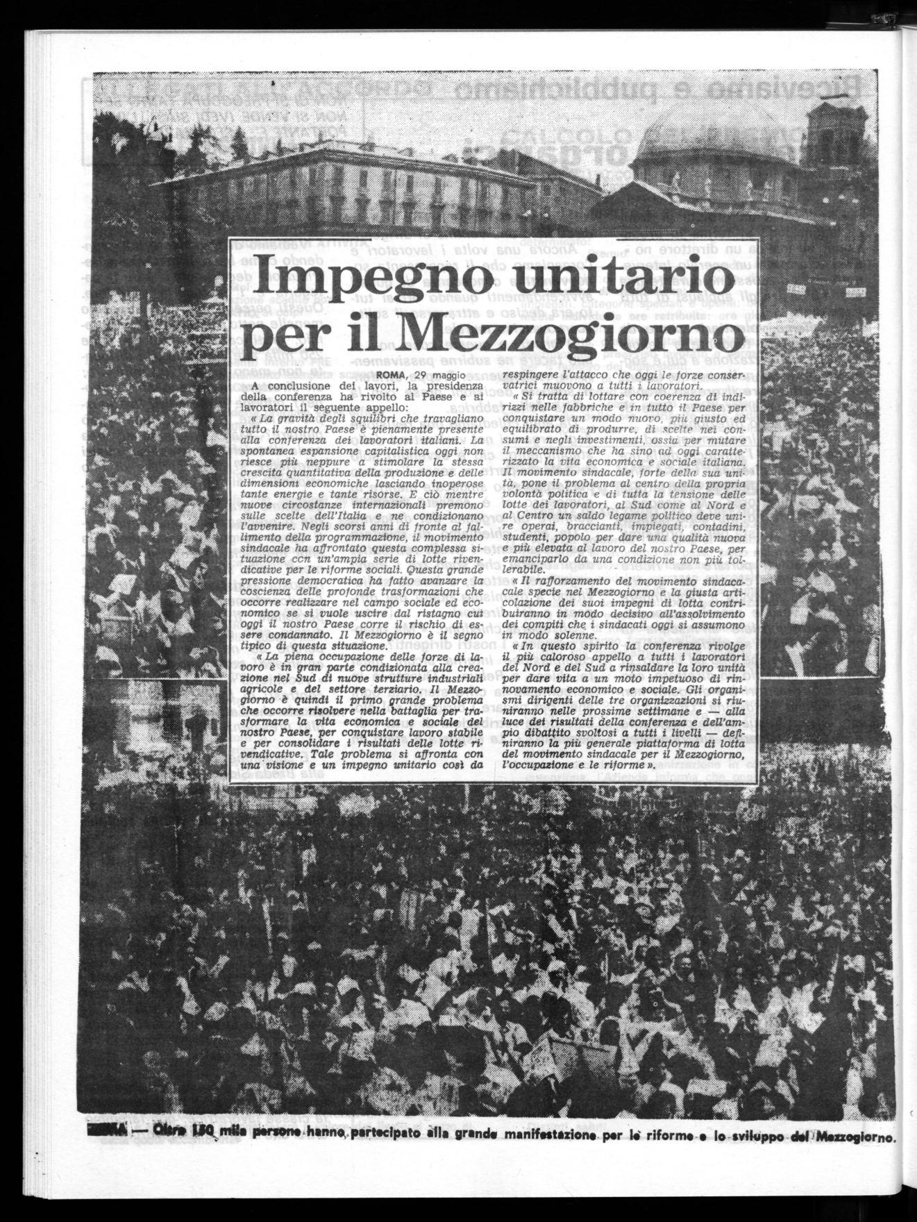 « La piena occupazione delle forze di lavoro è in gran parte condizionata alla creazione nel Sud di nuove strutture industriali agricole e del settore terziario. Il Mezzogiorno è quindi il primo grande problema che occorre risolvere nella battaglia per trasformare la vita economica e sociale del nostro Paese, per conquistare lavoro stabile e per consolidare i risultati delle lotte rivendicative. Tale problema si affronta con una visione e un impegno unitario cosi da