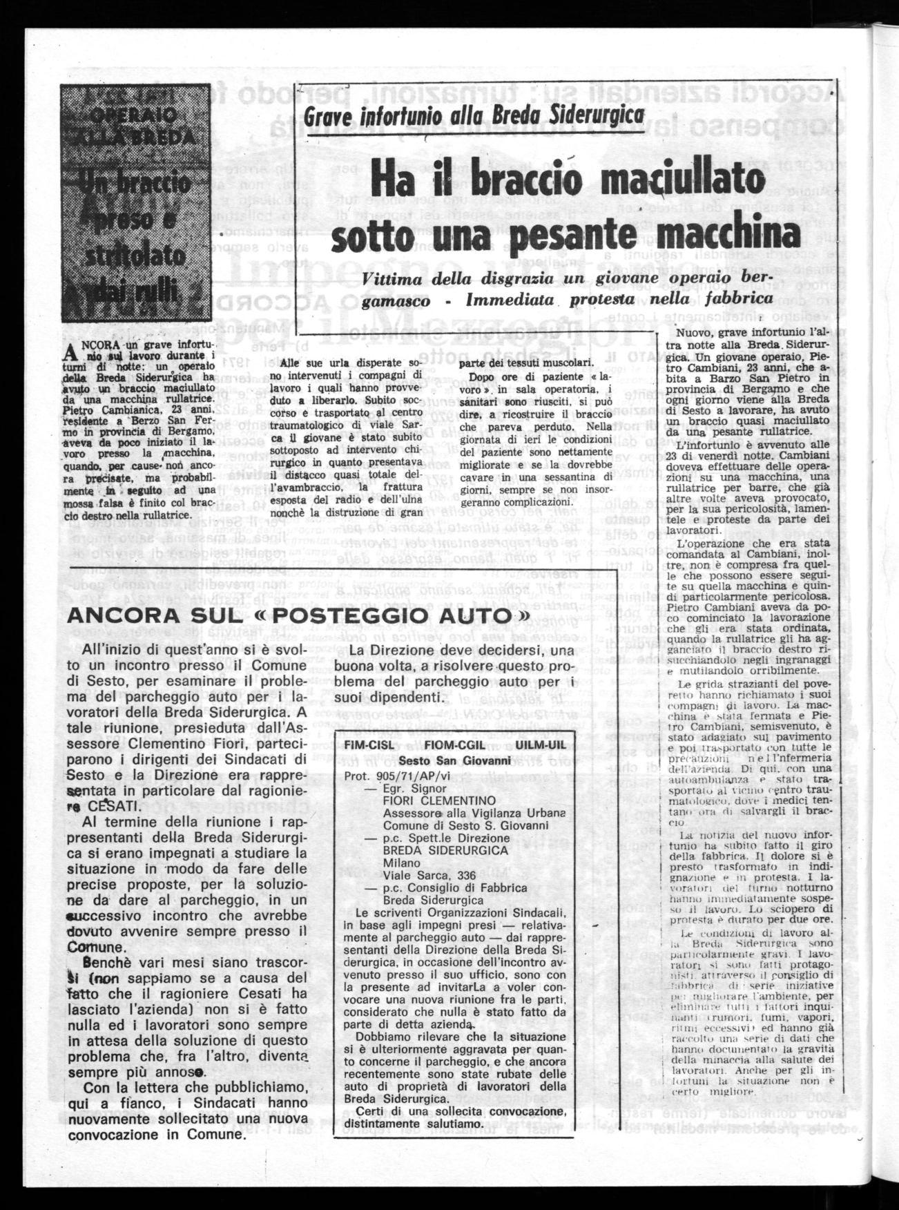 Dobbiamo rilevare che la situazione si è ulteriormente aggravata per quanto concerne il parcheggio, e che ancora recentemente sono state rubate delle auto di proprietà di lavoratori della Breda Siderurgica.