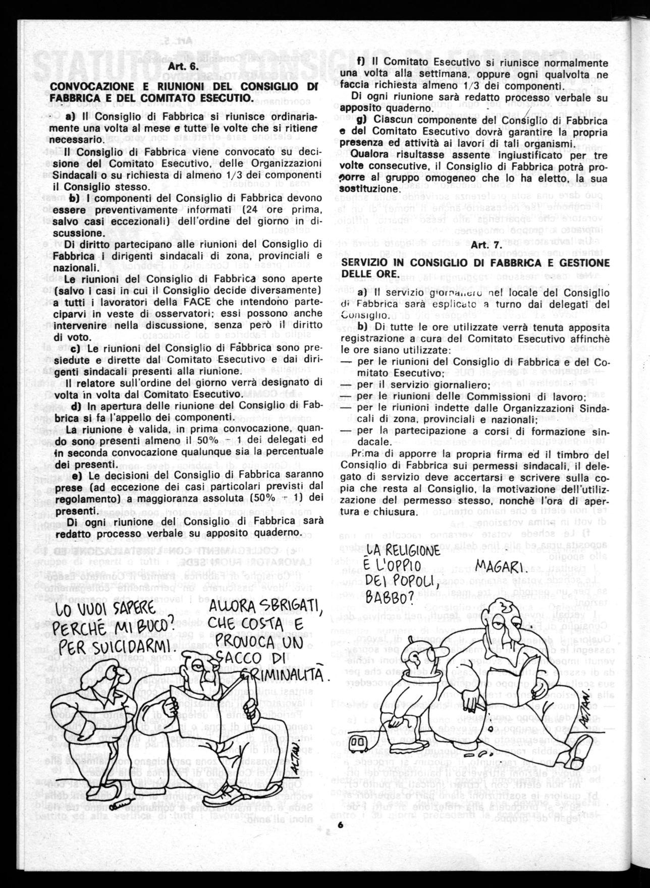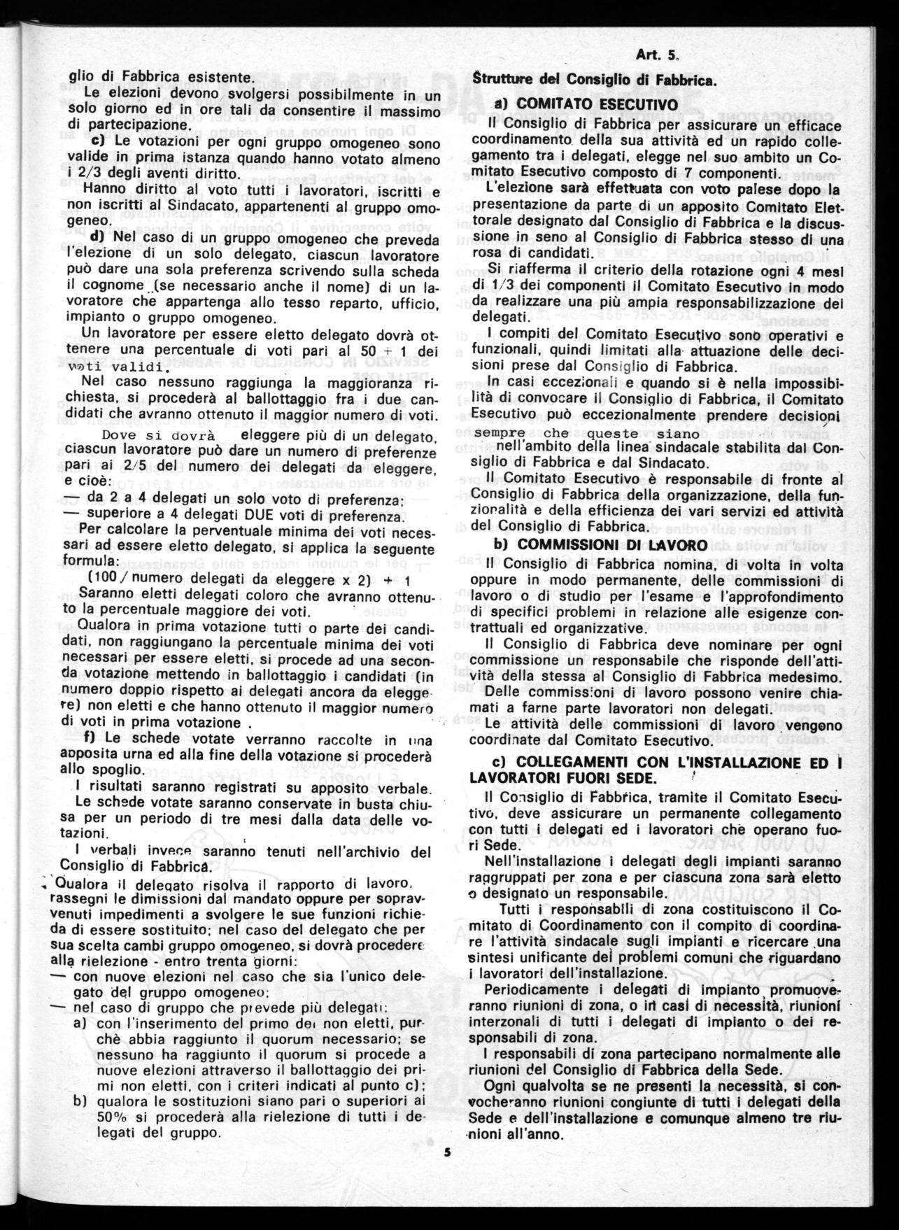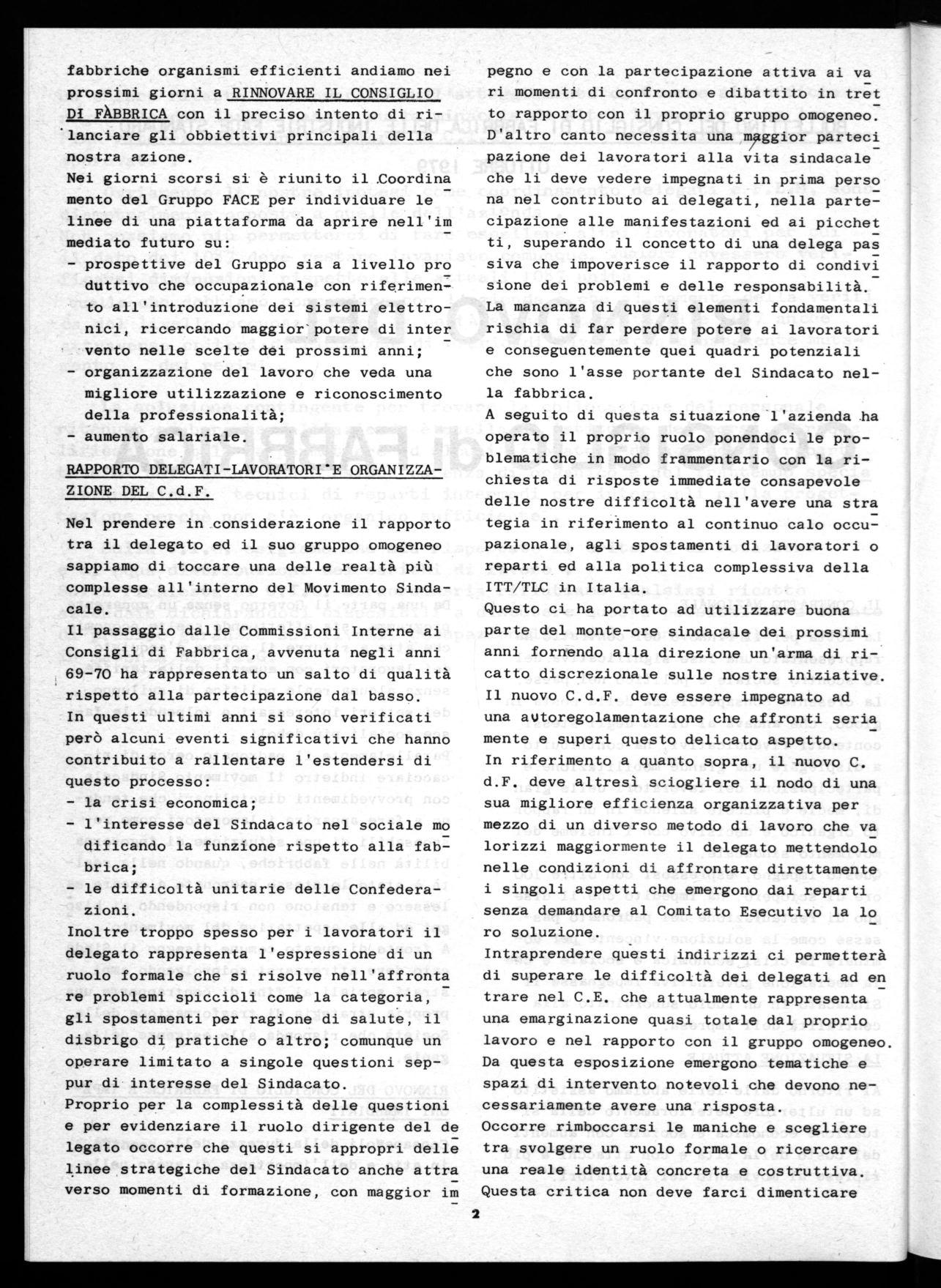 In riferimento a quanto sopra, il nuovo C. d.F. deve altresì sciogliere il nodo di una sua migliore efficienza organizzativa per mezzo di un diverso metodo di lavoro che va lorizzi maggiormente il delegato mettendolo nelle condizioni di affrontare direttamente i singoli aspetti che emergono dai reparti senza demandare al Comitato Esecutivo la lo ro soluzione.