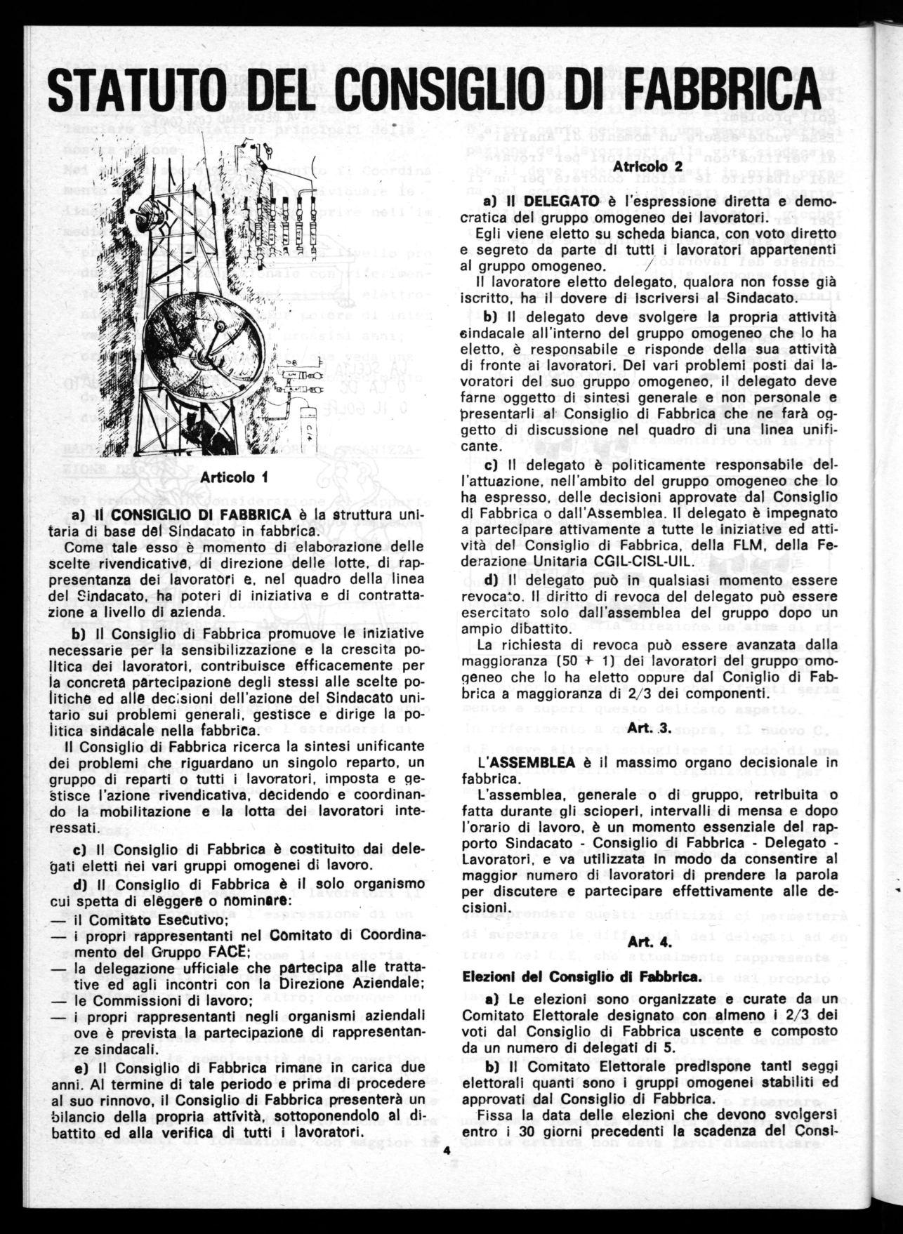 Il Consiglio di Fabbrica promuove le iniziative necessarie per la sensibilizzazione e la crescita politica dei lavoratori, contribuisce efficacemente per la concreta partecipazione degli stessi alle scelte politiche ed alle dec:sioni dell'azione del Sindacato unitario sui problemi generali, gestisce e dirige la politica sindacale nella fabbrica.