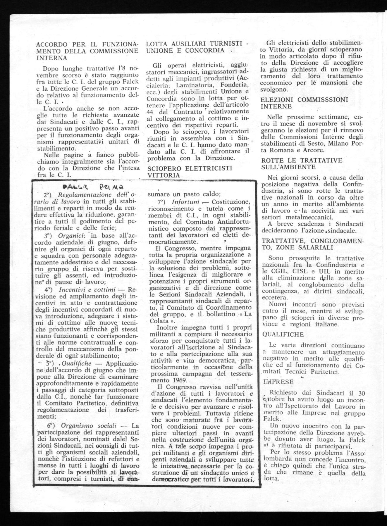 Il Congresso sottolinea il positivo sviluppo dell'azione sindacale unitaria realizzatosi nell'ultimo anno nelle aziende del gruppo che ha permesso di conquistare importantissimi e positivi accordi sia per gli operai che per gli impiegati. Contemporaneamente rileva il perdurare — ed in alcuni casi — l'aggravarsi delle condizioni di lavoro e di vita nell'interno delle aziende Falck ulteriormente appesantite dai non risolti problemi della società italiana come in particolare: il costo della vita, i trasporti, la casa, Li prevenzione sociale, le trattenute sui salari e stipendi.