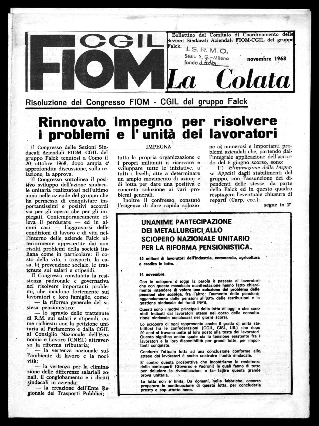 novembre 1968 Là nd° Colata Booln I e ittsiIind a odcealli Aziendali Comitato di Coordinamento FIOM-CGIL del gr u p delle zi alck. I. S, R. m , O. Sesto 5 G.-Milano