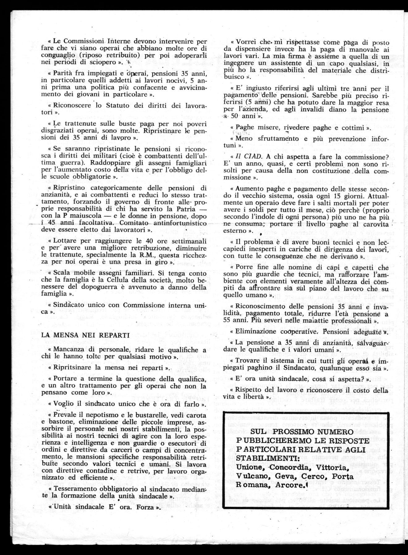 Continuare la battaglia per le pensioni. Facilitazioni per gli operai studenti, concedendo loro un po' più tempo per studiare. Togliere la trattenuta di R.M. I salari degli operai non sono certo una ricchezza, cercare di dare maggior impulio allo spirito di classe ».