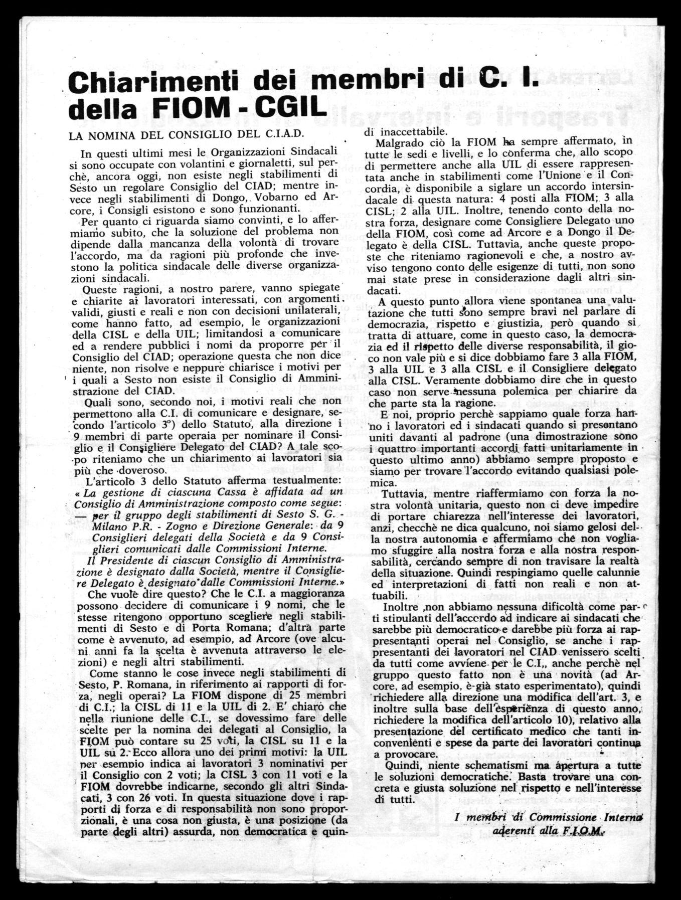 Queste ragioni, a nostro parere, vanno spiegate e chiarite ai lavoratori interessati, con argomenti . validi, giusti e reali e non con decisioni unilaterali, come hanno fatto, ad esempio, le organizzazioni della CISL e della UIL; limitandosi a comunicare ed a rendere pubblici i nomi da proporre per il Consiglio del CIAD; operazione questa che non dice niente, non risolve e neppure chiarisce i motivi per ' i quali a Sesto non esiste il Consiglio di Amministrazione del CIAD.
