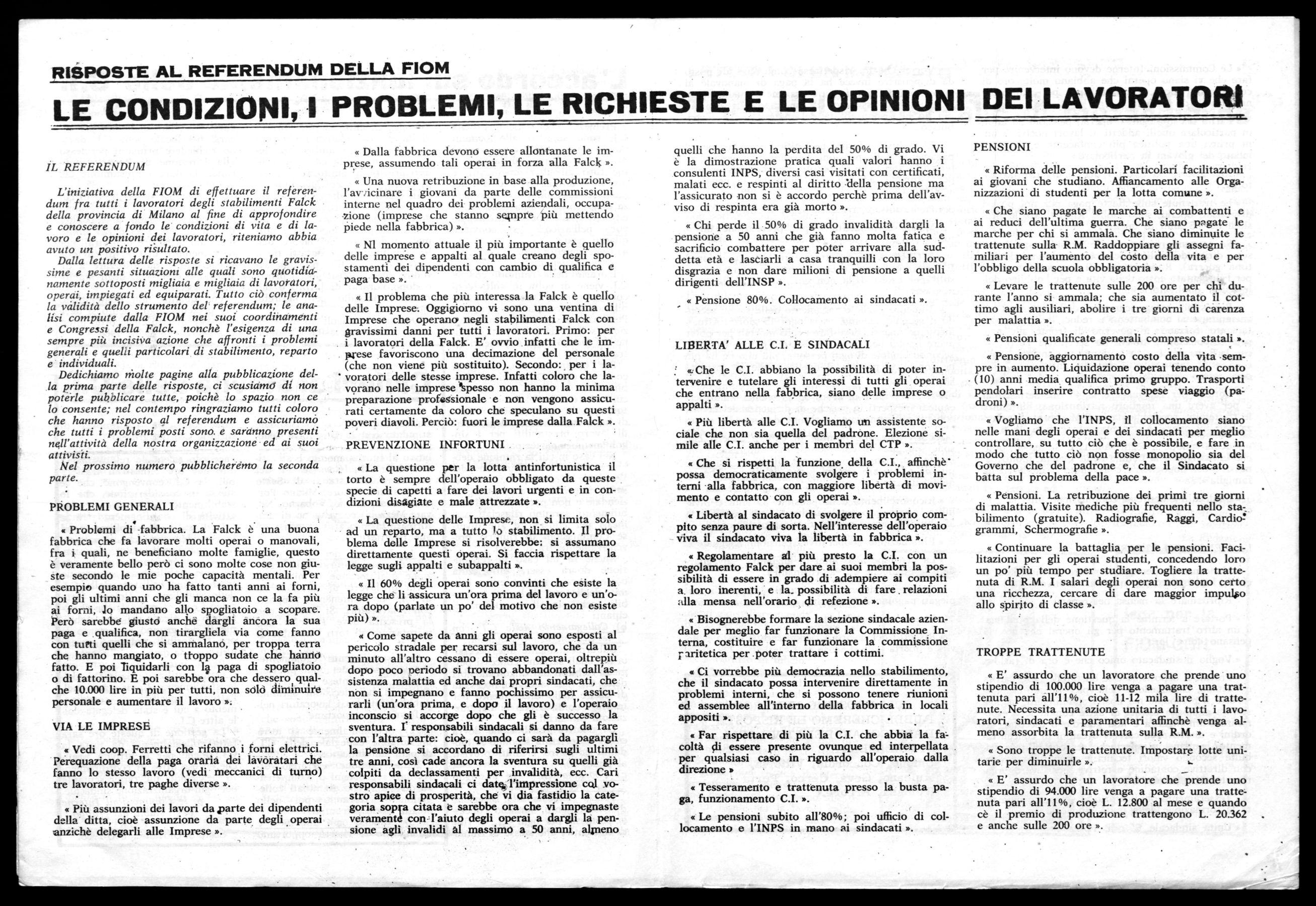 L'iniziativa della FIOM di effettuare il referendum fra tutti i lavoratori degli stabilimenti Falck della provincia di Milano al fine di approfondire conoscere a fondo le condizioni di vita e di lavoro e le opinioni dei lavoratori, riteniamo abbia avuto un positivo risultato.