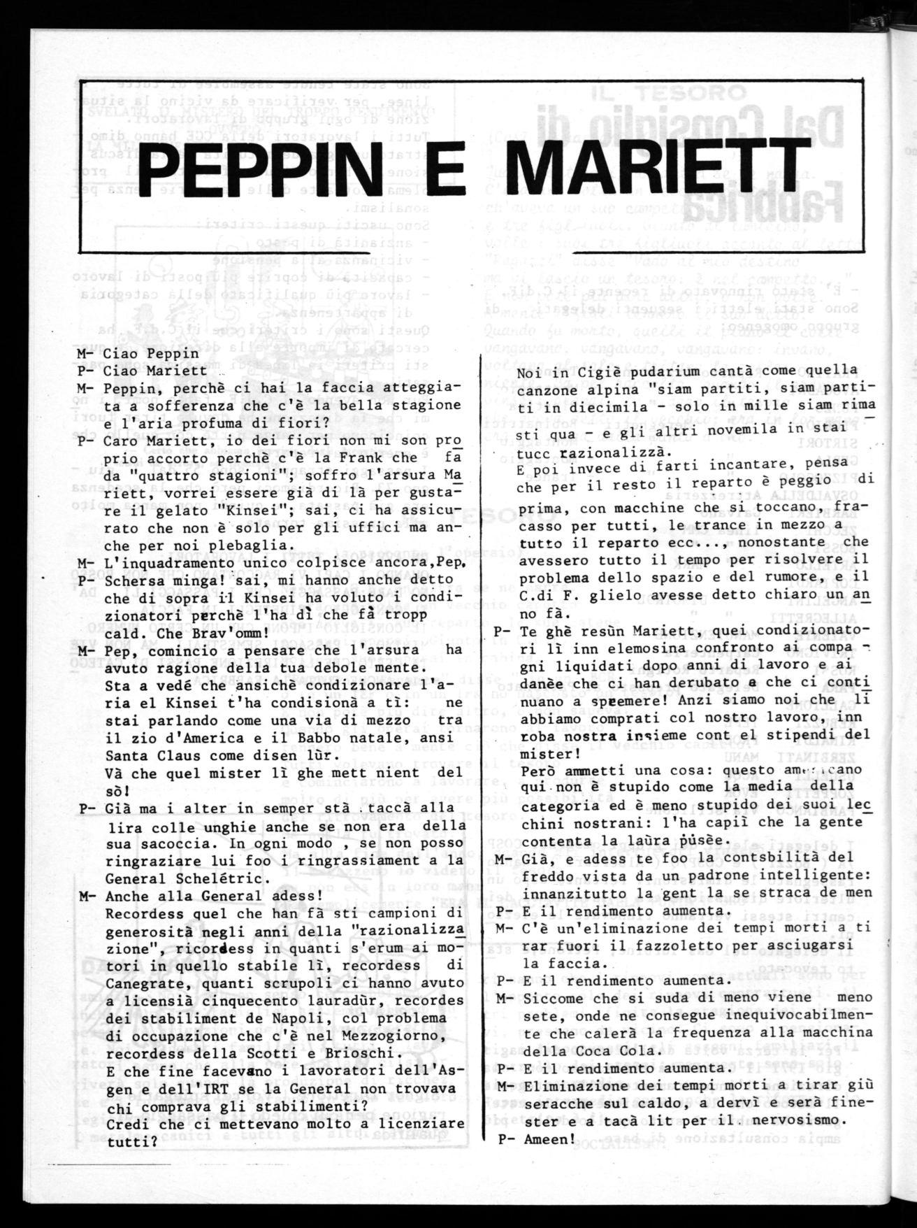 Il mio sogno sarebbe che tutti parlassero in assemblea, così potremmo avere i confron ti, i dialoghi, perchè solo con essi ci si può capire. Tanti dicono che le assemblee non servono a niente. Bene, invito codesti lavoratori a parlare con il Consiglio di Fabbrica così capiranno l'importanza delle assemblee, e non abbiate paura di parlare ricordatevi che non siamo più al tempo della repressione.