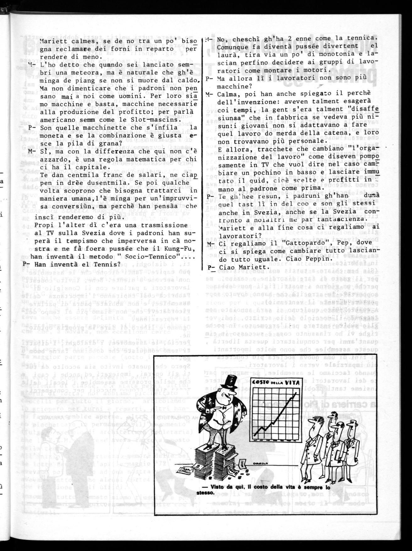 "1- L'ho detto che quando sei lanciato sembri una meteora, ma è naturale che gh'è minga de piang se non si muore dal caldo, Ma non dimenticare che i padroni non pen sano mai a noi come uomini. Per loro sia mo macchine e basta, macchine necessarie alla produzione del profitto; per parlà americano sem come le Slot-mascins.