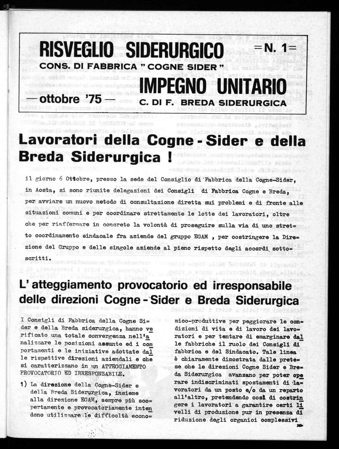 I Consigli di Fabbrica della Cogne Si= der e della Breda siderurgica, hanno ve rificato una totale convergenza nell'a nalizzare le posizioni assunte ed i com portamenti e le iniziative adottate dal le rispettive direzioni aziendali e che si caratterizzano in un ATTEGGIAMENTO PROVOCATORIO ED IRRESPONSABILE.