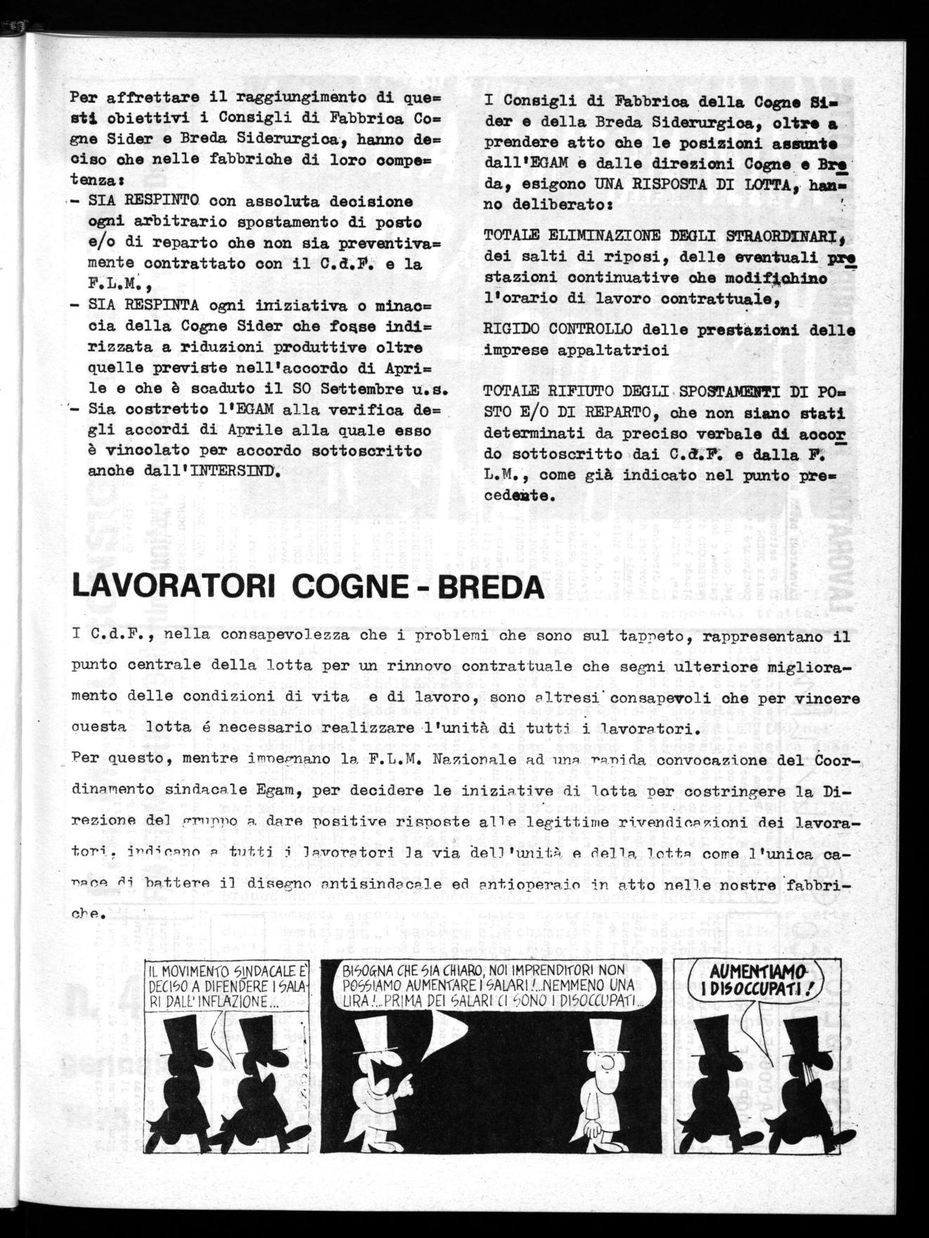 I Consigli di Fabbrica della Cogne Si= der e della Breda Siderurgica, oltre a prendere atto che le posizioni assunto dall'EGAM e dalle direzioni Cogne e Bre da, esigono UNA RISPOSTA DI LOTTA, hanno deliberato: