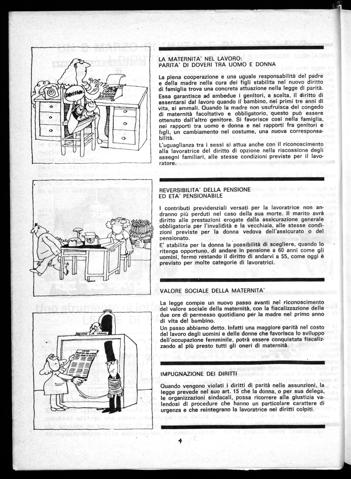 La piena cooperazione e una uguale responsabilità del padre e della madre nella cura dei figli stabilita nel nuovo diritto di famiglia trova una concreta attuazione nella legge di parità. Essa garantisce ad ambedue i genitori, a scelta, il diritto di assentarsi dal lavoro quando il bambino, nei primi tre anni di vita, si ammali. Quando la madre non usufruisca del congedo di maternità facoltativo e obbligatorio, questo può essere ottenuto dall'altro genitore. Si favorisce così nella famiglia, nei rapporti tra uomo e donna e nei rapporti fra genitori e figli, un cambiamento nel costume, una nuova corresponsabilità.