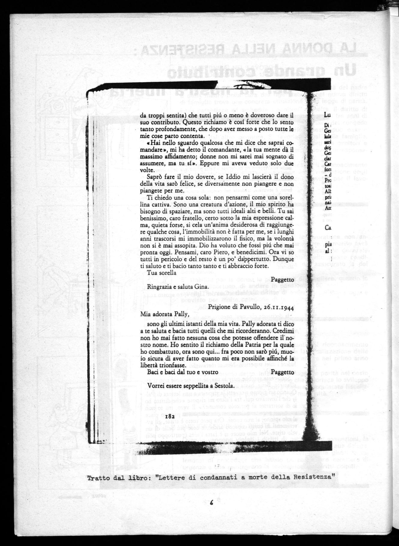 Mia adorata Pally, sono gli ultimi istanti della mia vita. Pally adorata ti dico a te saluta e bacia tutti quelli che mi ricorderanno. Credimi non ho mai fatto nessuna cosa che potesse offendere il' nostro nome. Ho sentito il richiamo della Patria per la quale ho combattuto, ora sono qui... fra poco non sarò piú, muoio sicura di aver fatto quanto mi era possibile affinché la libertà trionfasse.
