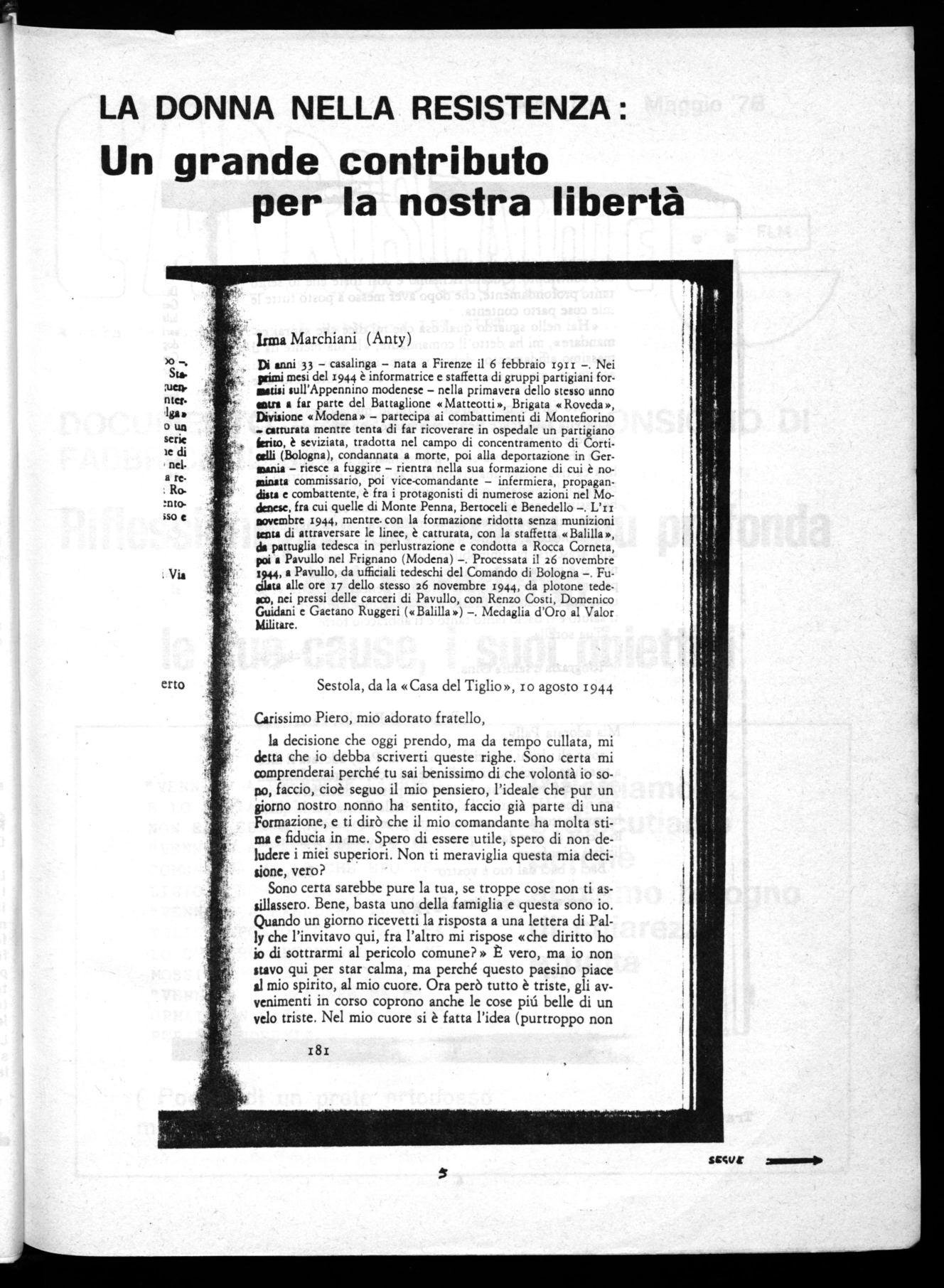 Carissimo Piero, mio adorato fratello, la decisione che oggi prendo, ma da tempo cullata, mi detta che io debba scriverti queste righe. Sono certa mi comprenderai perché tu sai benissimo di che volontà io sono, faccio, cioè seguo il mio pensiero, l'ideale che pur un giorno nostro nonno ha sentito, faccio già parte di una Formazione, e ti dirò che il mio comandante ha molta stima e fiducia in me. Spero di essere utile, spero di non deludere i miei superiori. Non ti meraviglia questa mia decisione, vero?