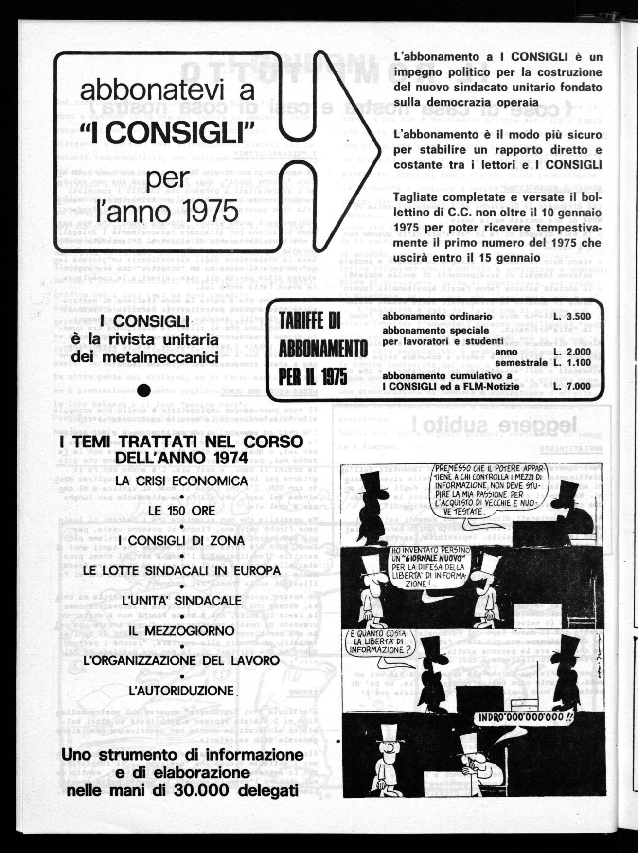TARIFFE DI ABBONAMENTO PER Il 1915 abbonamento ordinario L. 3.500 abbonamento speciale per lavoratori e studenti anno L. 2.000 semestrale L. 1.100 abbonamento cumulativo a I CONSIGLI ed a FLM-Notizie L. 7.000