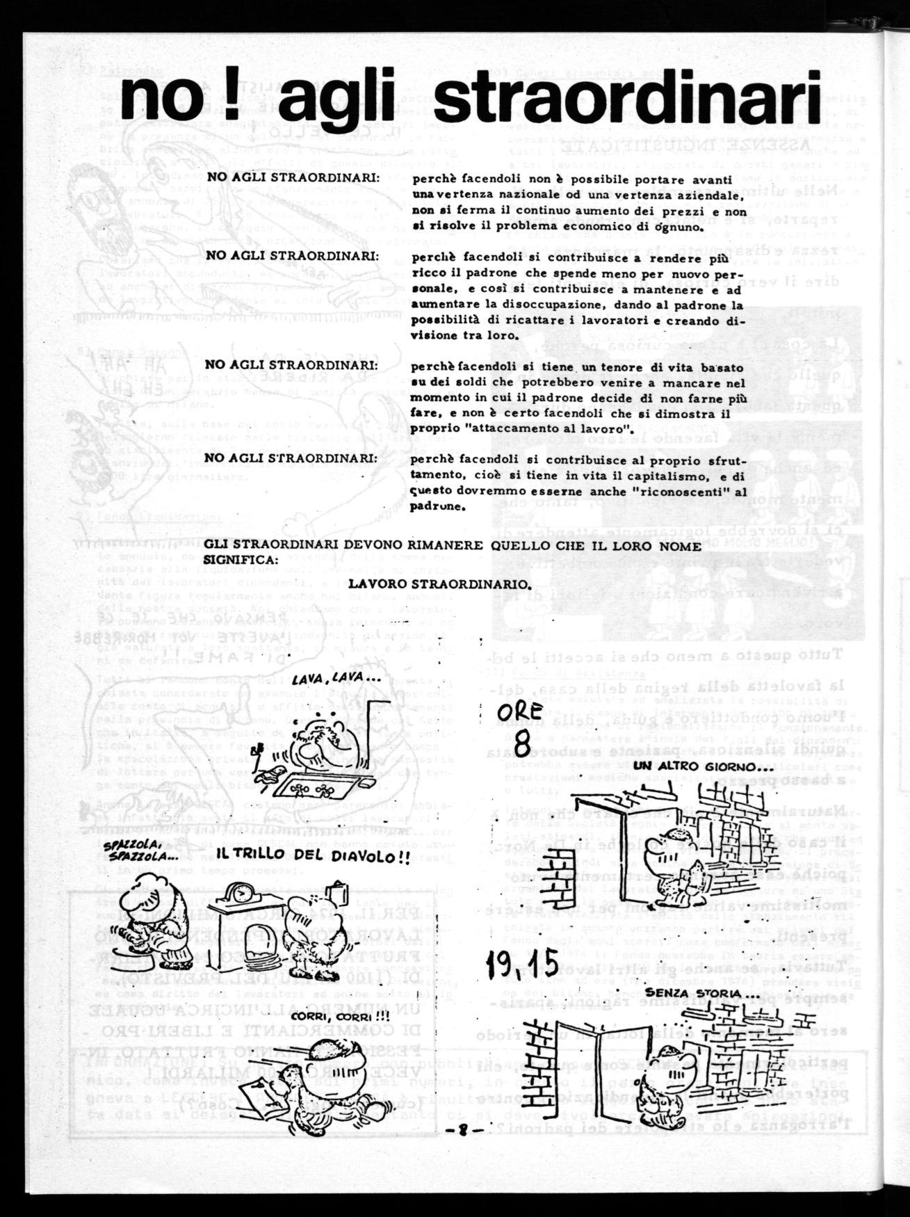 Noi crediamo che a parte la moda italiana di mettere sullo stesso piano petrolieri (o Marzollo e Sindona) ladri di polli, sarebbe opportuno che i compagni, so non vogliono che si rilevi la divergenza tra quanto dicono o pensano e quanto fanno, facciano a meno anche di rubare i polli, cioè di fare lo straordinario. Questo non è ovviamento solo rivolto al compagno che è stato rimbeccato dal "giovane leone".