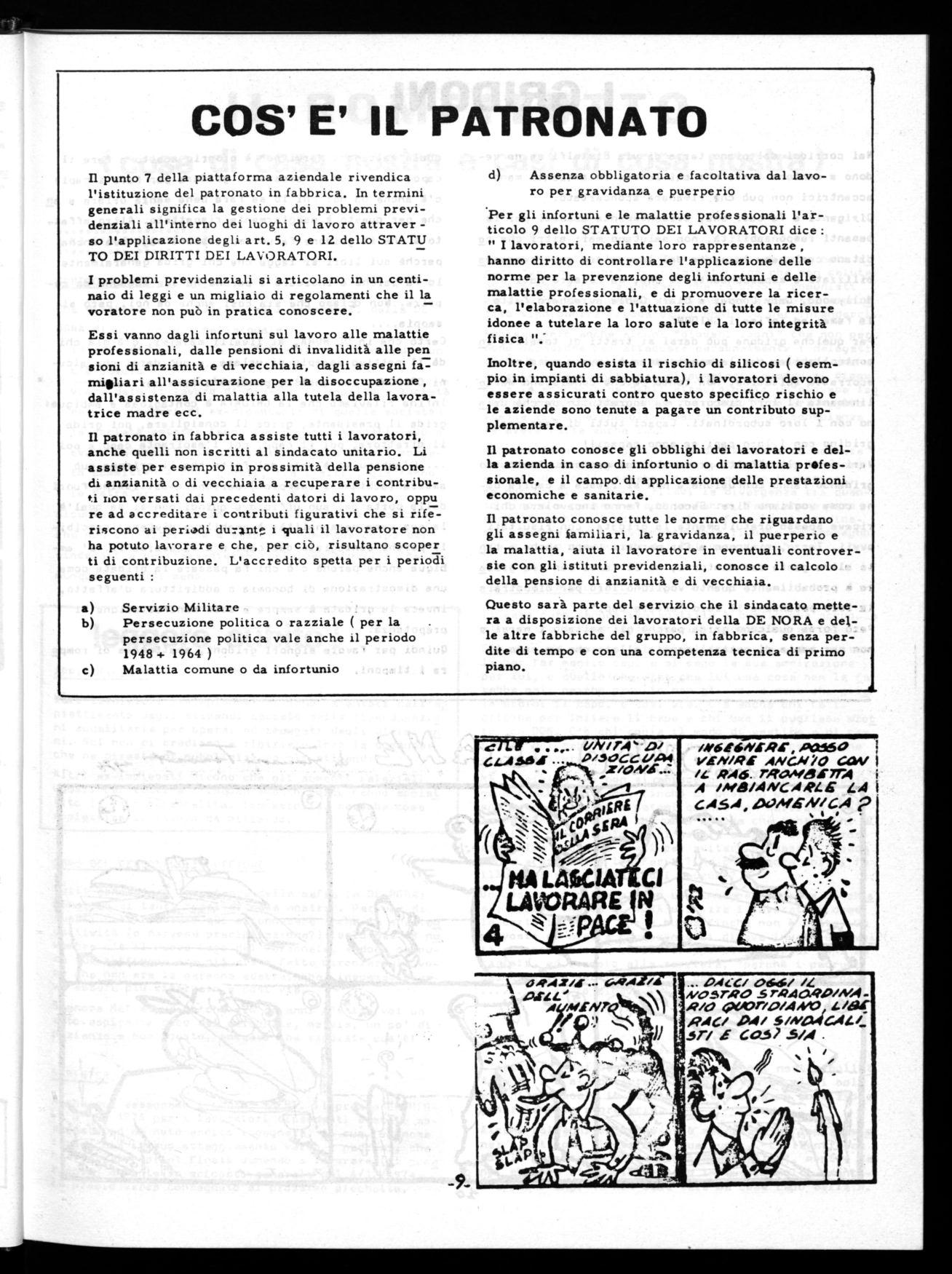 Spieghiamo in un articolo a parte cos'è il patronato e quali servizi rende. L'innegabile necessità di poter utilizzare adeguatamente questi servizi impone la presenza di un delegato del patronato in fabbrica almeno per alcune ore a settimana, e la parte cipaziol., a tott5 oli effetti di questo delegato al CdF. Intendiamo ch,ind„ chiedere il riconoscimento di questc servizio e lo stanziamento di un monte ore annuale di 250 ore per permettere di assistere i lavoratori. E' stato individuato dal'CdF, per que sta funzione, il delegato .con ietti, che ha già se guito un apposito corso organizzato dal Patronato.