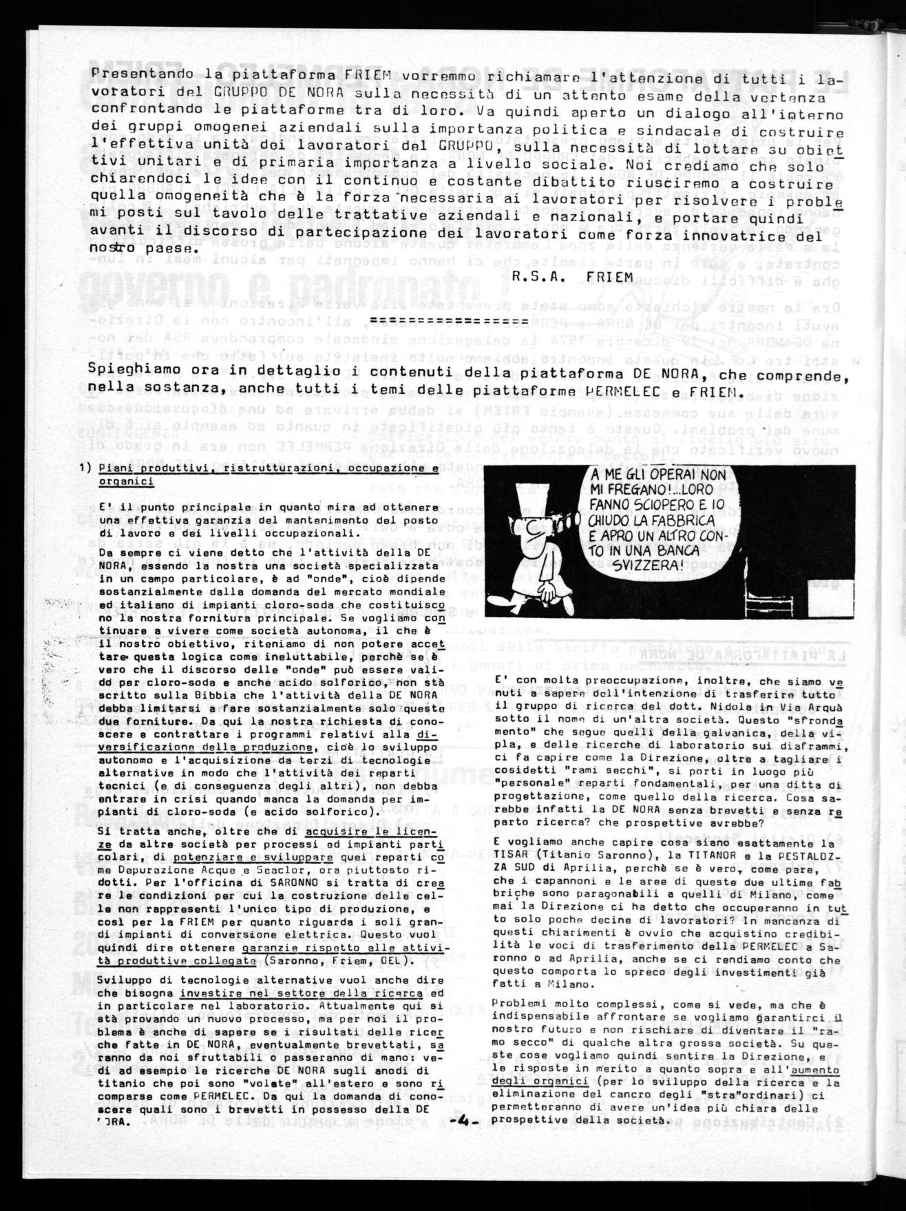 Presentando la piattaforma FRIEM vorremmo richiamare l'attenzione di tutti i lavoratori del GRUPPO DE NORA sulla necessiUì di un attento esame della vertenza confrontando le piattaforme tra di loro. Va quindi aperto un dialogo all'ipterno dei gruppi omogenei aziendali sulla importanza politica e sindacale di costruire l'effettiva unità dei lavoratori del GRUPPO, sulla necessità di lottare su obiet tivi unitari e di primaria importanza a livello sociale. Noi crediamo che solo chiarendoci le idee con il continuo e costante dibattito riusciremo a costruire quella omogeneità che è la forza' necessaria ai lavoratori per risolvere i proble mi posti sul tavolo delle trattative aziendali e nazionali, e portare quindi avanti il discorso di partecipazione dei lavoratori come forza innovatrice del nostro paese.