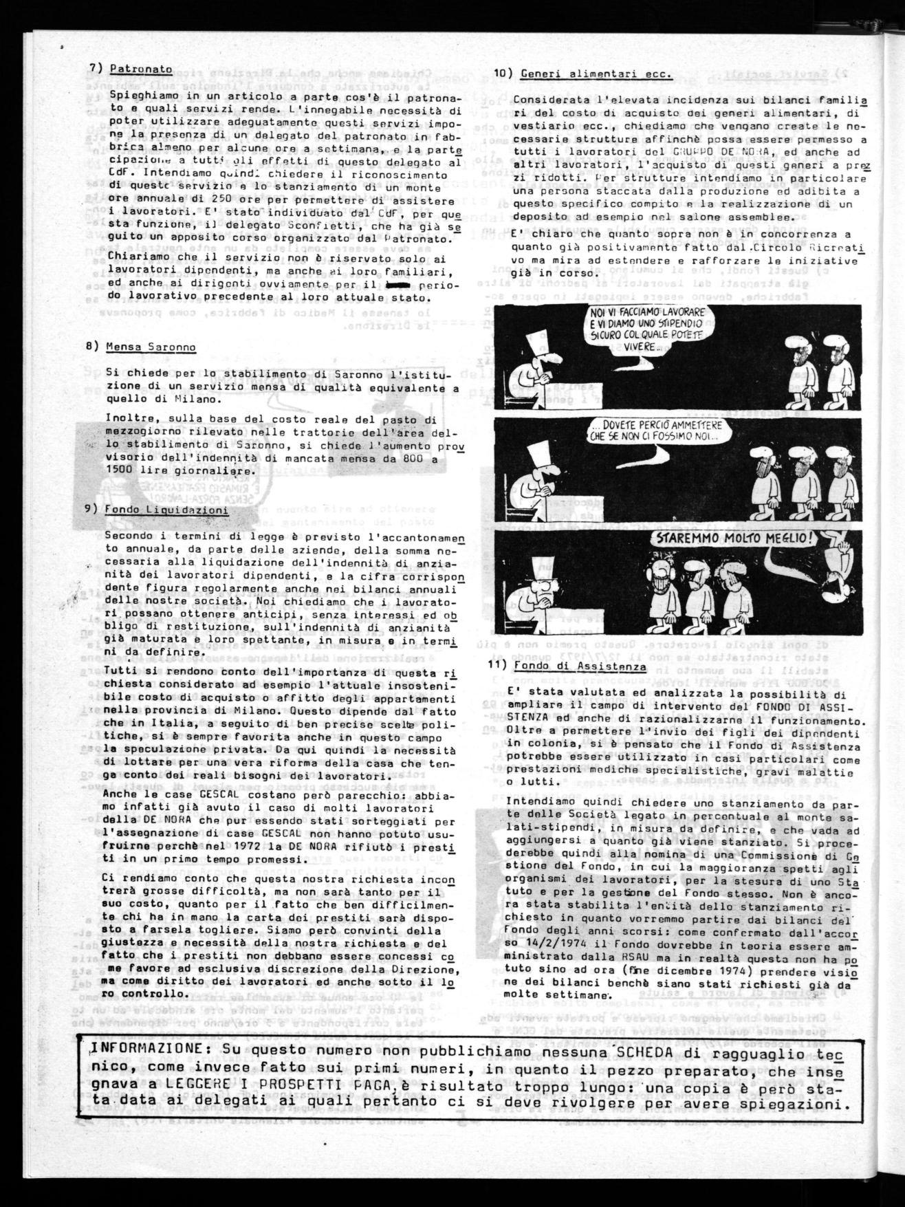 Il punto 7 della piattaforma aziendale rivendica l'istituzione del patronato in fabbrica. In termini generali significa la gestione dei problemi previdenziali all'interno dei luoghi di lavoro attraverso l'applicazione degli art. 5, 9 e 12 dello STATU TO DEI DIRITTI DEI LAVORATORI.