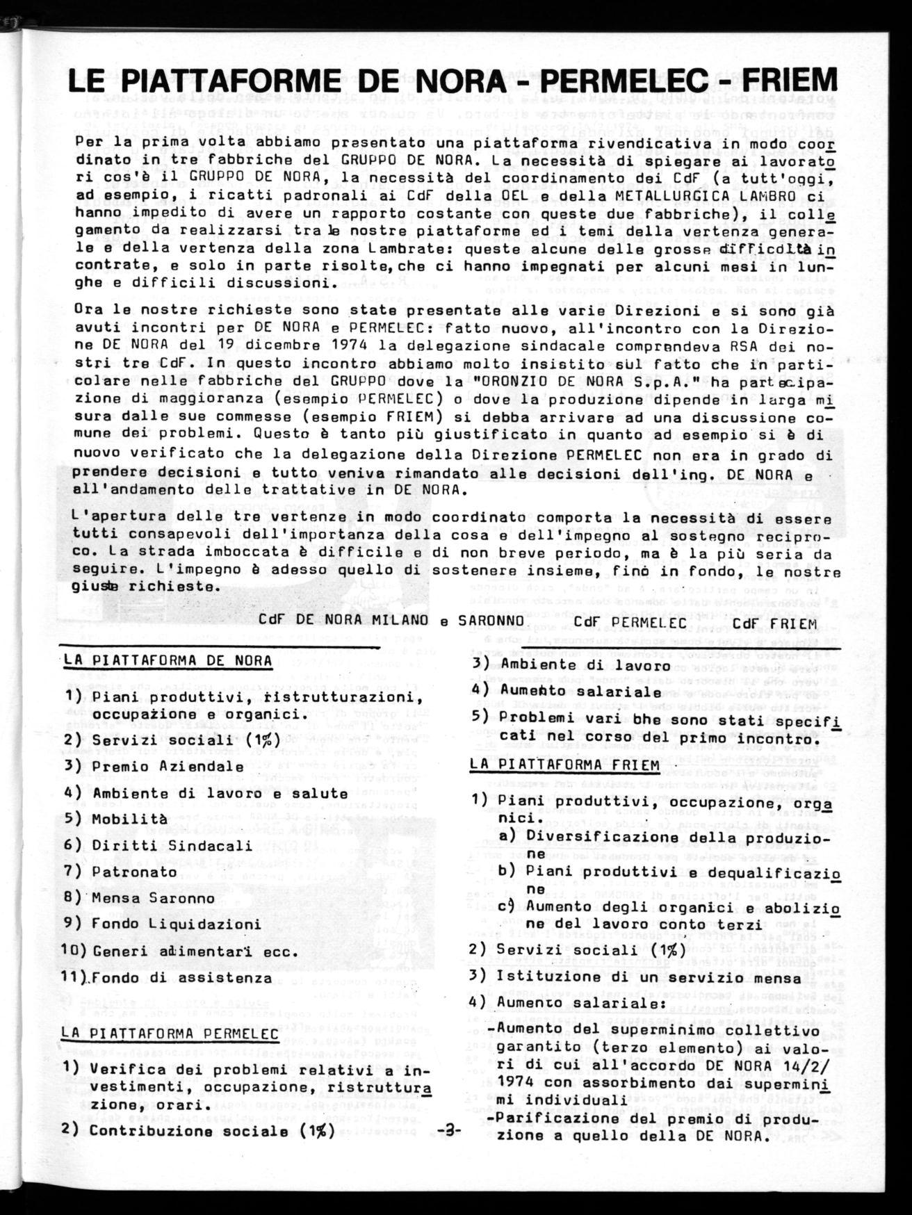 Ora le nostre richieste sono state presentate alle varie Direzioni e si sono già avuti incontri per DE NORA e PERMELEC: fatto nuovo, all'incontro con la Direzione DE NORA del 19 dicembre 1974 la delegazione sindacale comprendeva RSA dei nostri tre CdF. In questo incontro abbiamo molto insistito sul fatto che in particolare nelle fabbriche del GRUPPO dove la "ORONZIO DE NORA S.p.A." ha partecipazione di maggioranza (esempio PERMELEC) o dove la produzione dipende in larga mi sura dalle sue commesse (esempio FRIEM) si debba arrivare ad una discussione comune dei problemi. Questo è tanto più giustificato in quanto ad esempio si è di nuovo verificato che la delegazione della Direzione PERMELEC non era in grado di prendere decisioni e tutto veniva rimandato alle decisioni dell'ing. DE NORA e all'andamento delle trattative in DE NORA.
