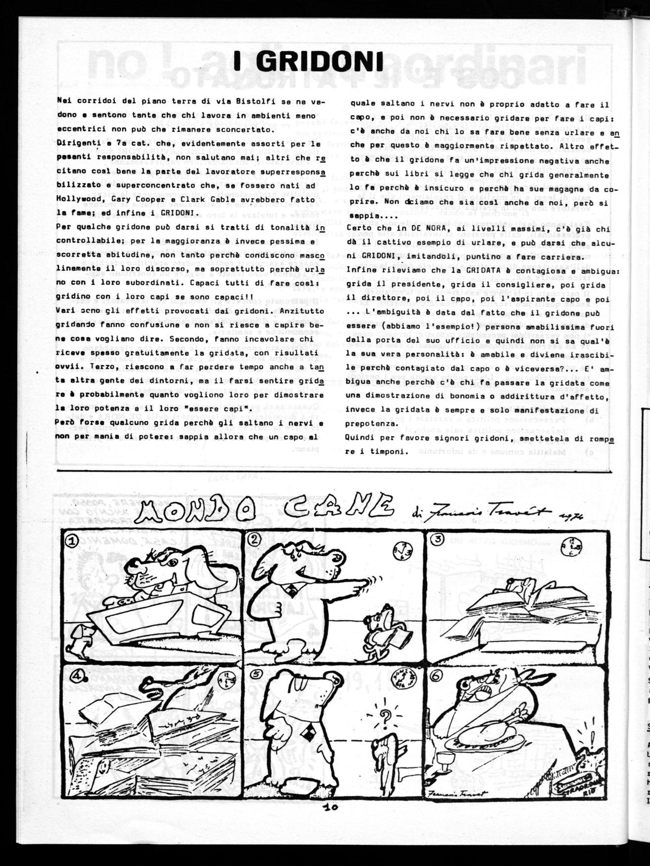 Al secondo piano di via Bistolfi abbiamo come noto al cuni "vecchi leoni", quei 7a cot: cioè che non saluta no i sindacalisti e pensano che in URSS i comunisti mangino ancora i bambini e siano trinariciuti: menta lità tipo guerra fredda degli anni '50 per intenderci. Abbiamo però anche alcuni "giovani leoni" che non per dono occasione per attaccare personalmente i delegati chi è esplicitamente di sinistra. E' accaduto anche durante un'assemblea dei disegnatori, quando si discu teva la sospensione degli straordinari: un"giovane leo ne" ha infatti detto ad un "sinistro" che era meglio stesse zitto perchè gli straordinari e le consulenze le aveva fatte anche lui.