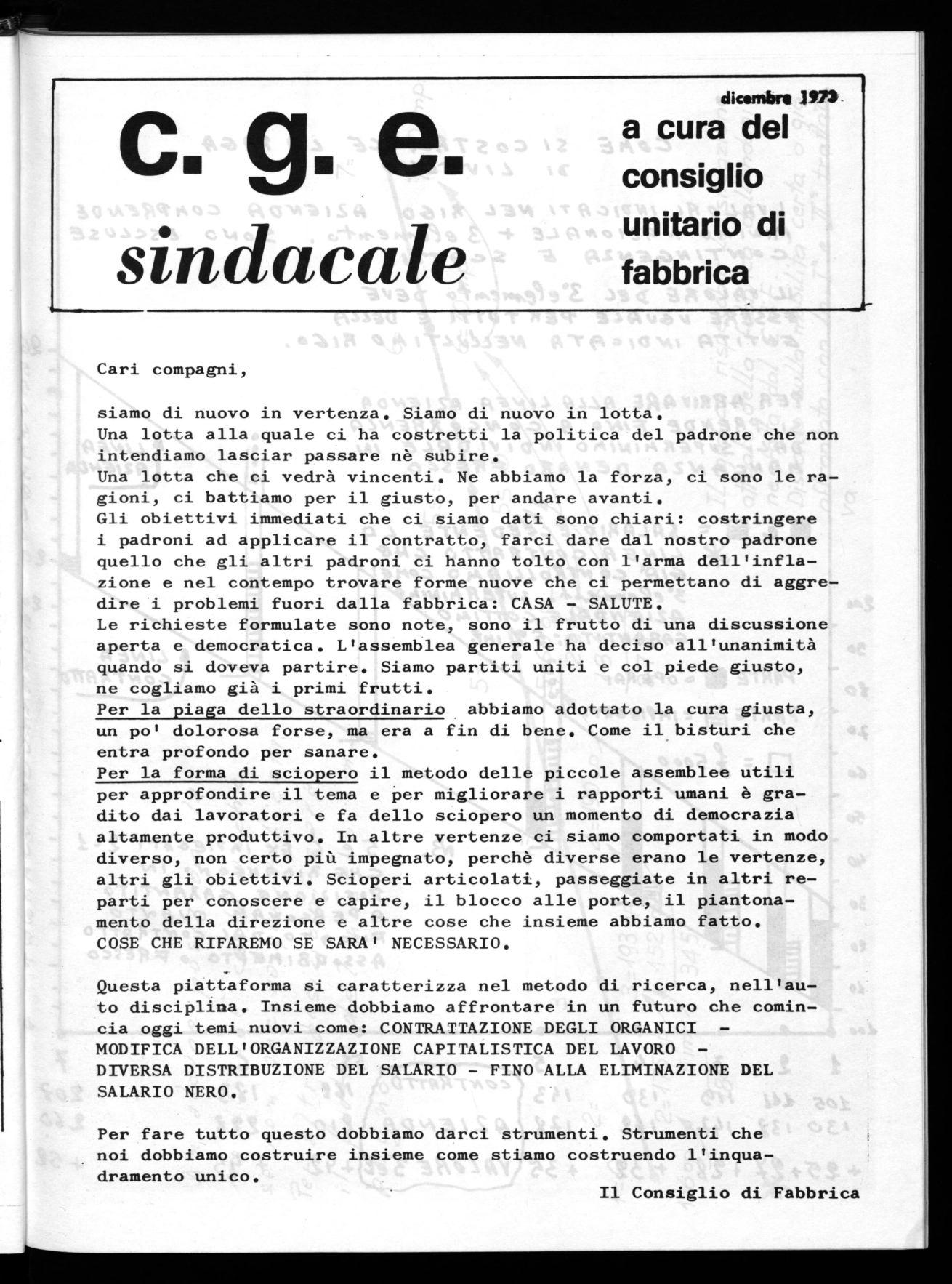Gli obiettivi immediati che ci siamo dati sono chiari: costringere i padroni ad applicare il contratto, farci dare dal nostro padrone quello che gli altri padroni ci hanno tolto con l'arma dell'inflazione e nel contempo trovare forme nuove che ci permettano di aggredirei problemi fuori dalla fabbrica: CASA - SALUTE.