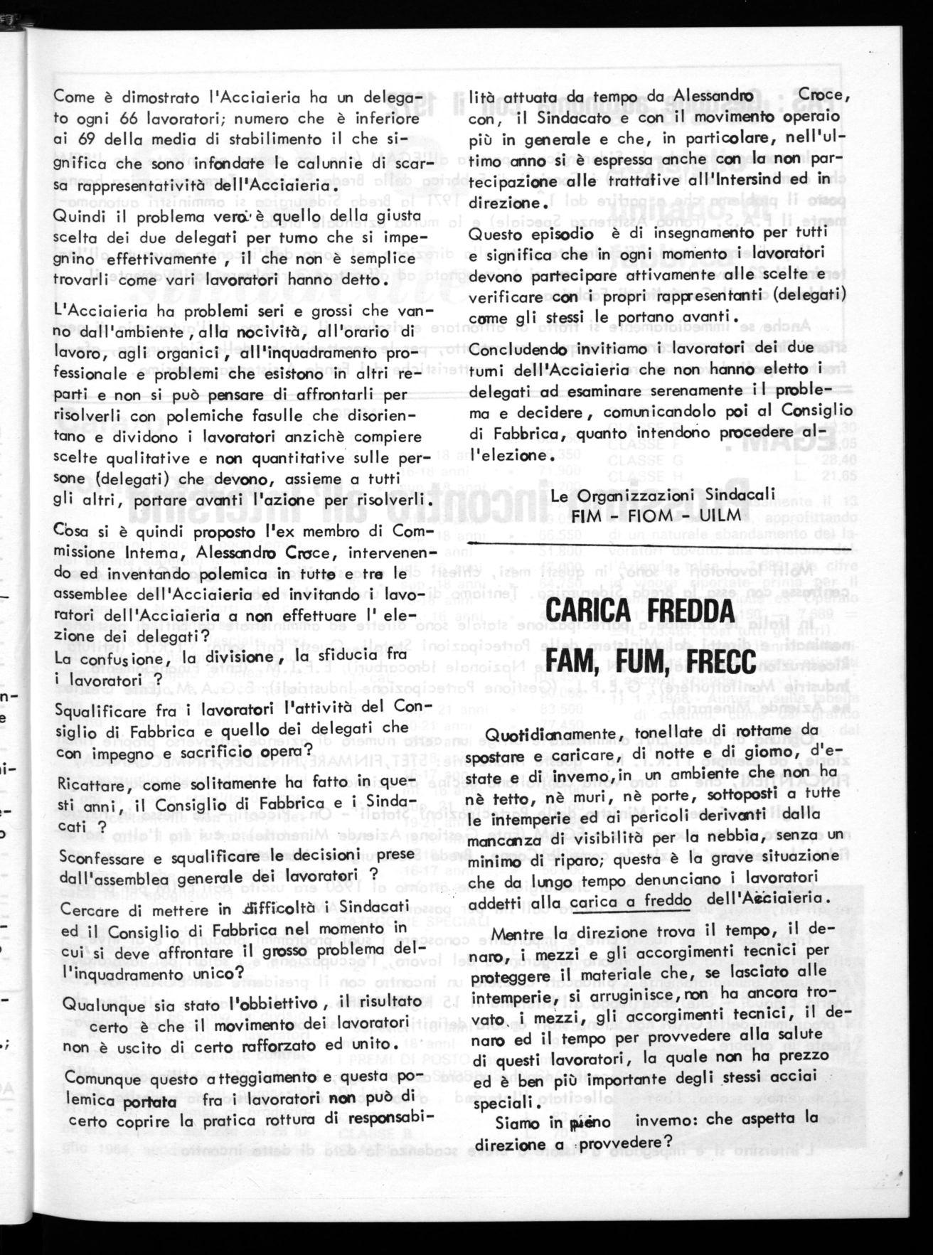 Concludendo invitiamo i lavoratori dei due turni dell'Acciaieria che non hanno eletto i delegati ad esaminare serenamente i I problema e decidere, comunicandolo poi al Consiglio di Fabbrica, quanto intendono procedere all'elezione.