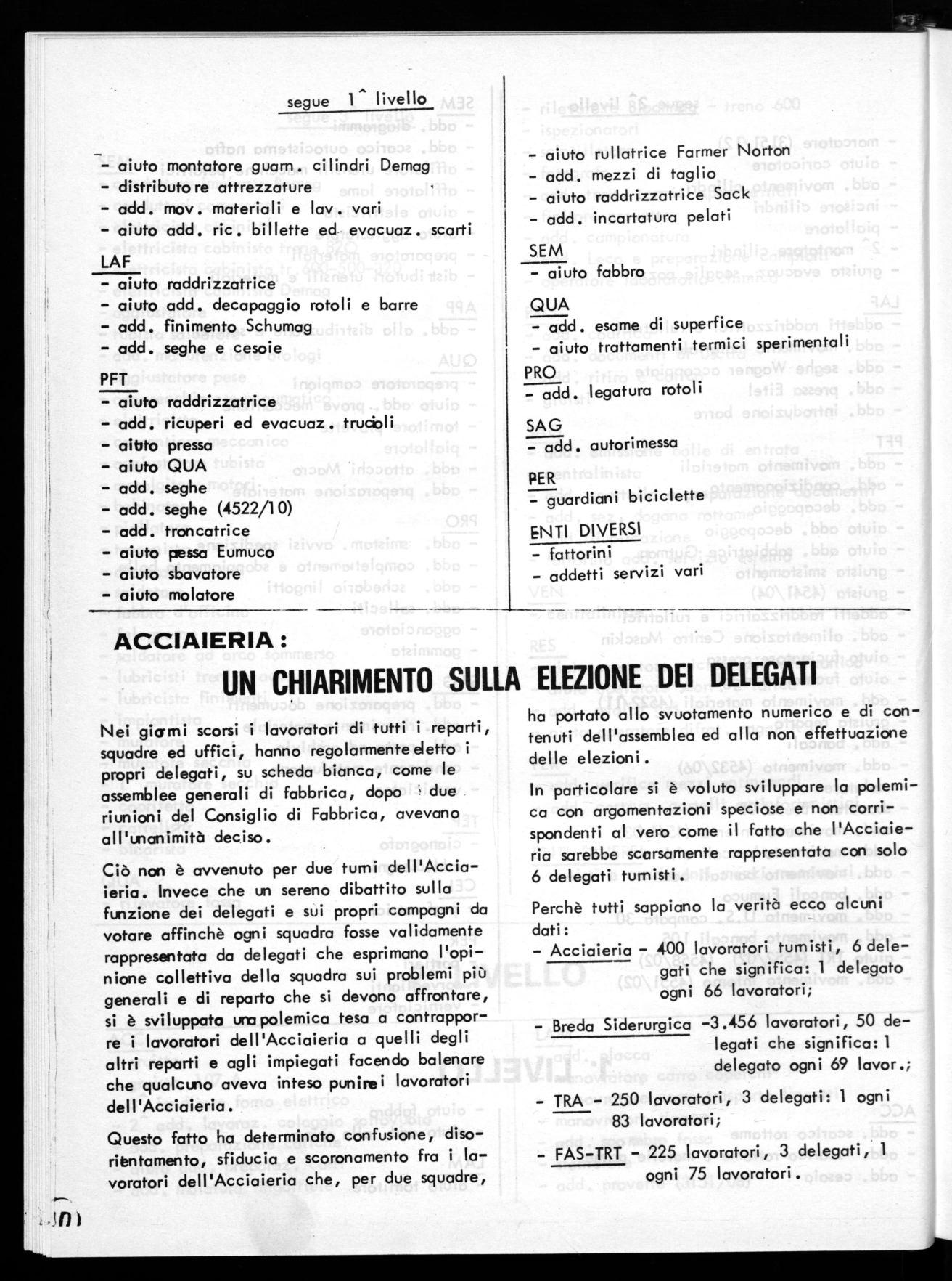 Ciò non è avvenuto per due turni dell'Acciaieria. Invece che un sereno dibattito sulla funzione dei delegati e sui propri compagni da votare affinchè ogni squadra fosse validamente rappresentata da delegati che esprimano l'opinione collettiva della squadra sui problemi più generali e di reparto che si devono affrontare, si è sviluppato una polemica tesa a contrapporre i lavoratori dell'Acciaieria a quelli degli altri reparti e agli impiegati facendo balenare che qualcuno aveva inteso punirei lavoratori dell 'Acciaieria .