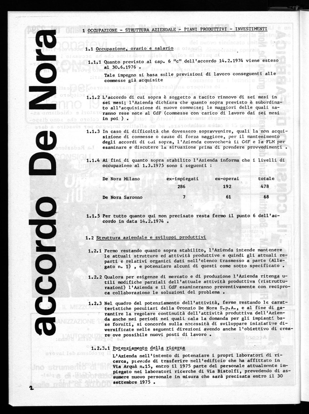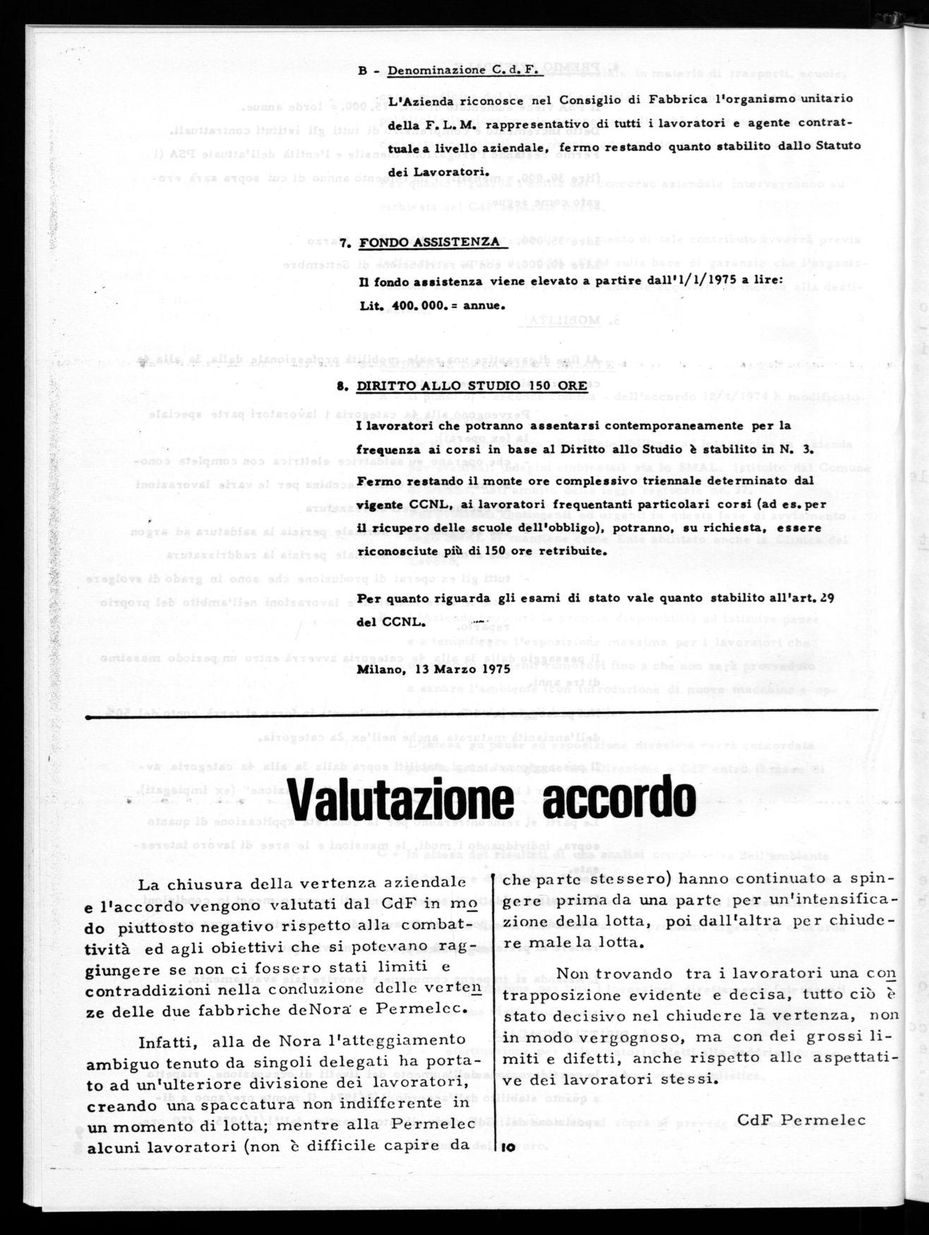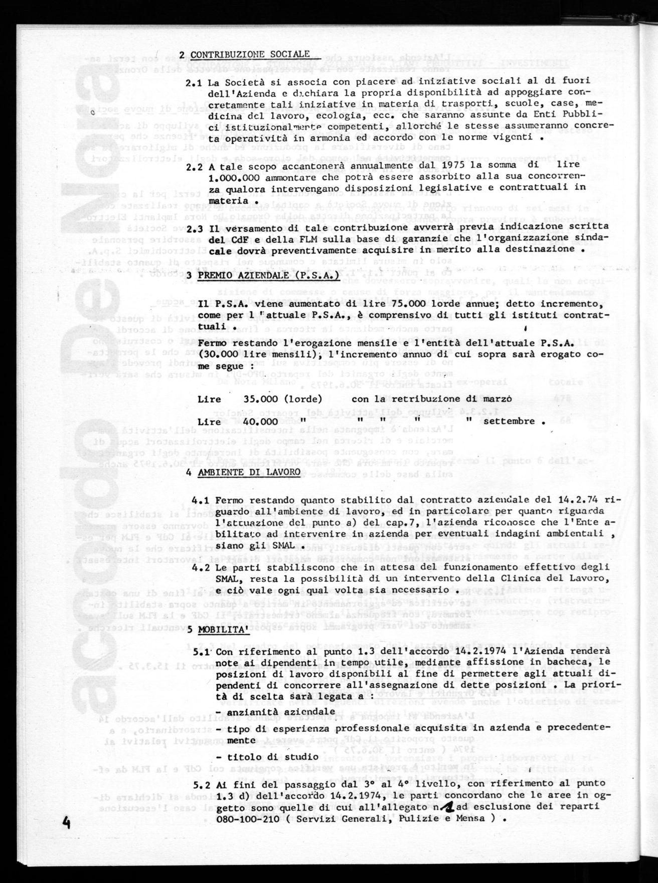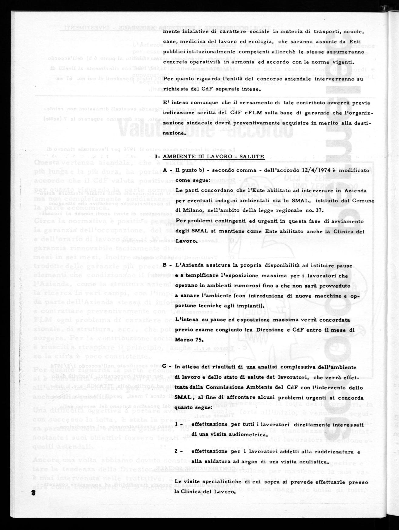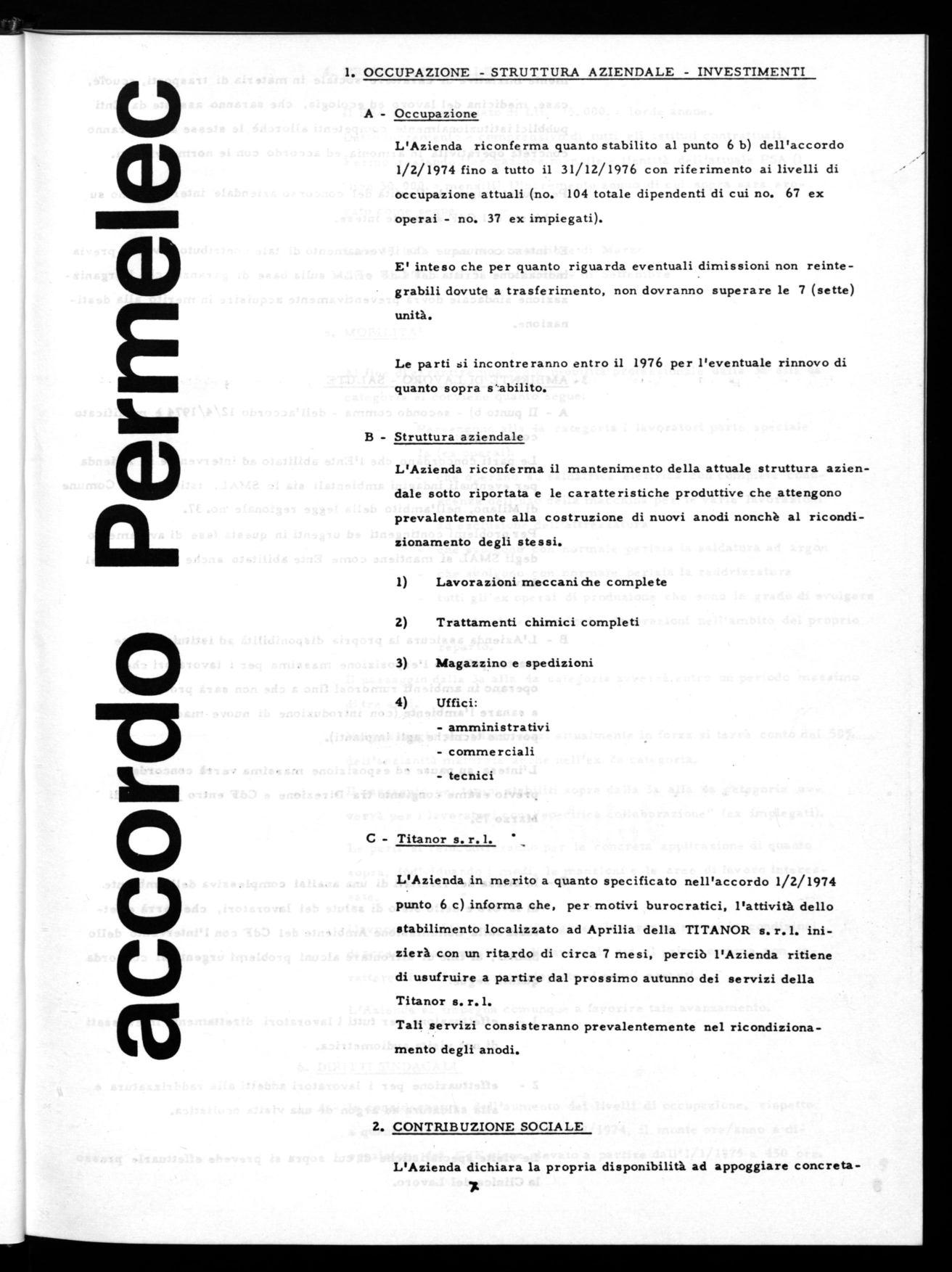 Circa la normativa è positivo perchè dà la garanzia dell'occupazione, del salario e dell'orario di lavoro fino al 30.6. 1976, garanzia rinnovabile tacitamente di sei mesi in sei mesi. Inoltre sono state introdotte delle garanzie più precise per elementi che condizionano il futuro dell'Azienda, come la struttura aziendale e la ricerca in vari campi, con l'impegno da parte dell'Azienda stessa di informare e contrattare preventivamente con CdF e FLM ogni problema di carattere occupazionale, di struttura, ecc., che potrebbe sorgere. Per la contribuzione sociale, si è riusciti a strappare il principio, anche se la cifra è poco consistente.