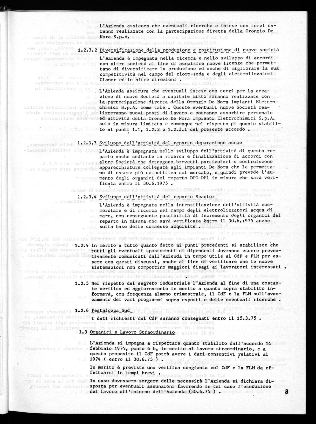 L'Azienda è impegnata nello sviluppo dell'attività di questo reparto anche mediante la ricerca e finalizzazione di accordi con altre Società che detengono brevetti particolari o costruiscono apparecchiature collegate agli impianti De Nora che le permettano di essere più competitiva sul mercato, e quindi prevede l'aumento degli organici del reparto DPO-DP1 in misura che sarà verificata entro il 30.6.1975 .