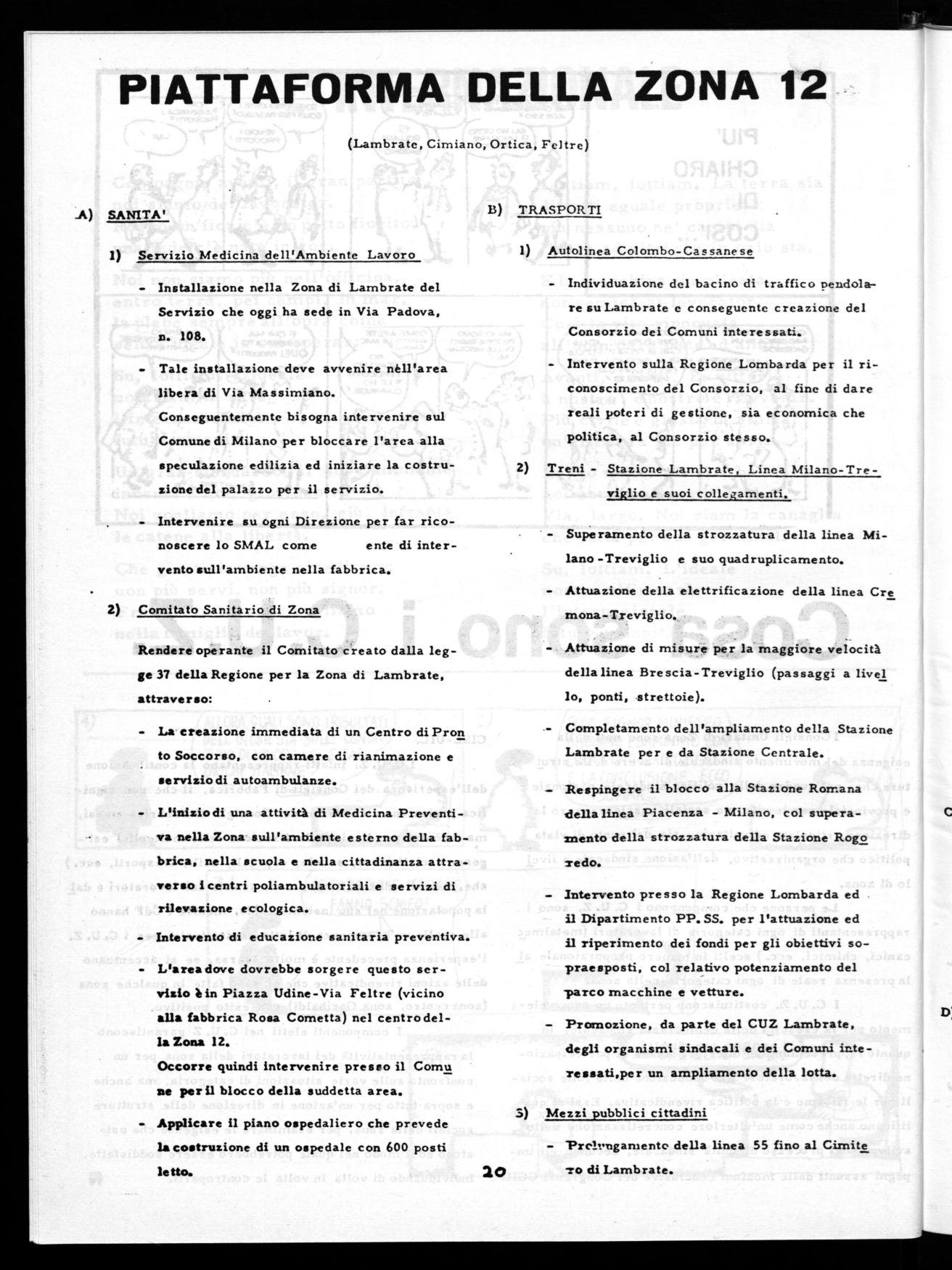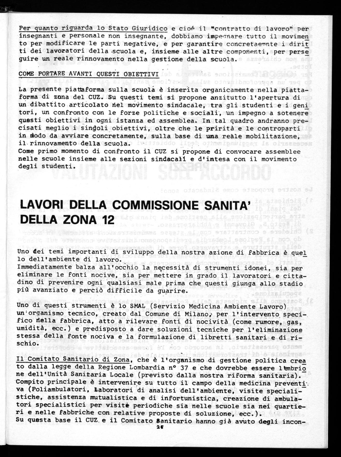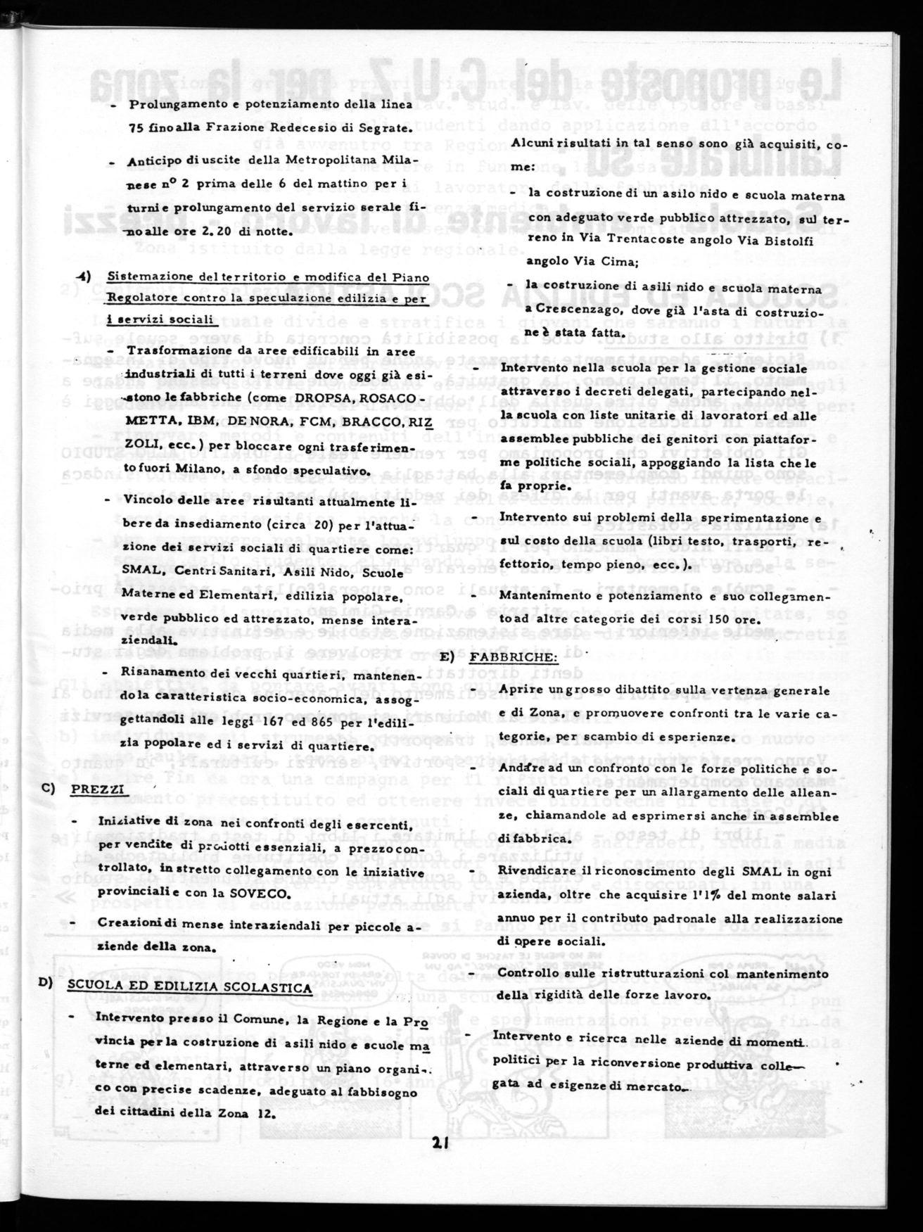 refezione - gratuità prioritariamente per la scuola dell'obbligo trasporti - gratistità per i lav. stud. e lav. delle 150 ore e bassi costi per gli studenti dando applicazione dll'accordo già avvenutro tra Regione e Sindacato. mense - costrúire o rimettere in funzione la mensa nelle scuole superiori'aprendole ai lavoratori delle fabbriche. - servizio prevenzione e assistenza medicarenderlo effettivo e deve essere promosso dal Comitato Sanitario 'di Zona istituito dalla legge regionale.