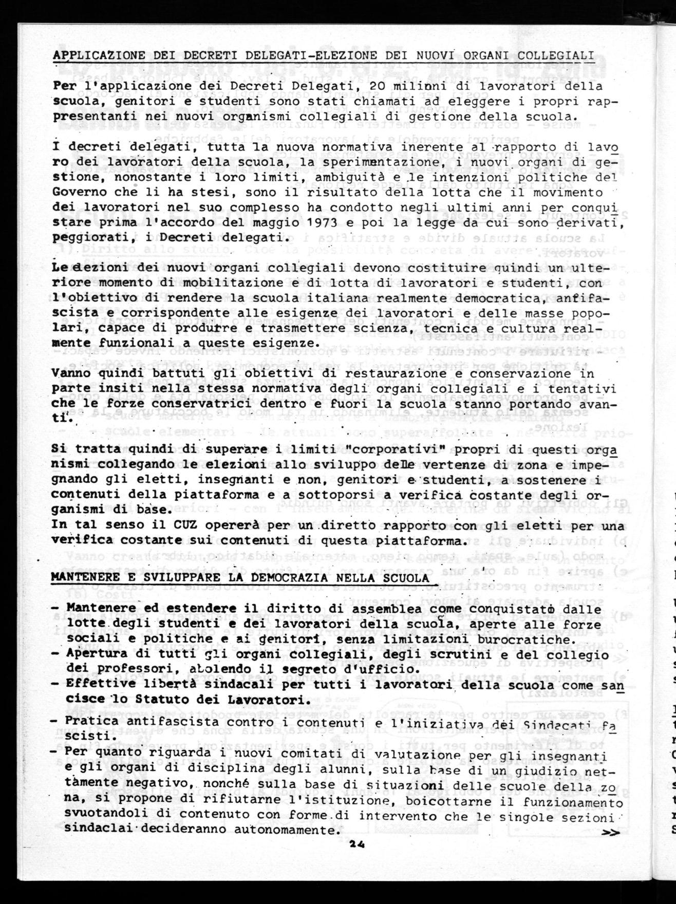 - Per quanto riguarda i nuovi comitati di valutazione per gli insegnanti e gli organi di disciplina degli alunni, sulla base di un giudizio nettàmente negativo, nonché sulla base di situazioni delle scuole della zo na, si propone di rifiutarne l'istituzione, boicottarne il Funzionamento svuotandoli di contenuto con forme.di intervento che le singole sezioni' sindaclai.decideranno autonomamente.