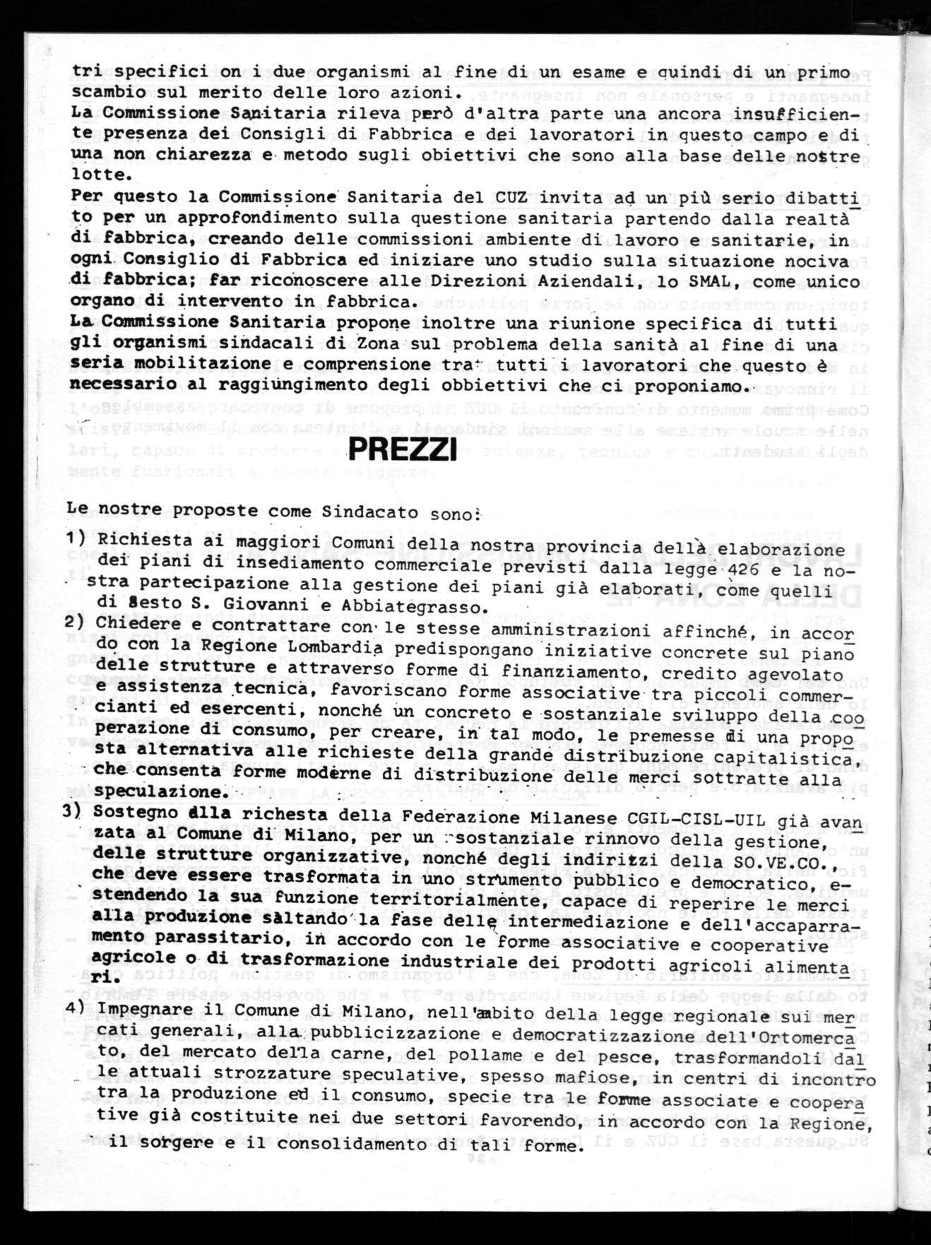 Chiedere e contrattare con•le stesse amministrazioni affinché, in accor do con la Regione Lombardia predispongano iniziative concrete sul piano delle strutture e attraverso forme di finanziamento, credito agevolato e assistenza tecnica, favoriscano forme associative tra piccoli commercianti ed esercenti, nonché un concreto e sostanziale sviluppo della coo perazione di consumo, per creare, in' tal modo, le premesse di una propo sta alternativa alle richieste della grande distribuzione capitalistica, che consenta forme moderne di distribuzione delle merci sottratte alla speculazione.