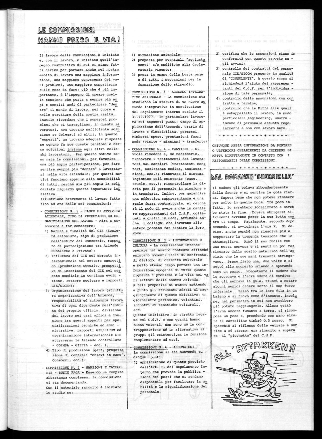 Il lavoro delle commissioni è iniziato e, con il lavoro, è iniziato quell'impegno costruttivo di cui ci siamo fatti carico per portare anche nel nostro ambito di lavoro una maggiore informazione, una maggiore conoscenza dei vari problemi, una maggiore compattezza sulle cose da fare; ciò che è più importante, è l'impegno di creare quella tensione che porta a sempre più am pi e sentiti modi dl partecipare "den tro" il mondo di lavoro, nel cuore e nelle strutture della nostra realtà. Inutile ricordare che i numerosi problemi che ci travagliano, in quanto la voratori, non trovano sufficiente solu rione se delegati ad altri, in quanto "esperti", ma trovano adeguate risposte se ognuno fa sue queste tensioni e cerca soluzioni insieme agli altri colleghi lavoratori. Per questo motivo sono nate le commissioni, per favorire una più ampia partecipazione, per fare sentire sempre più "dentro" i lavoratori nella vita aziendale; per questi motivi facciamo appello alla sensibilità di tutti, perchè sia più ampia la soli darietà riguardo questa importante ini ziativa.