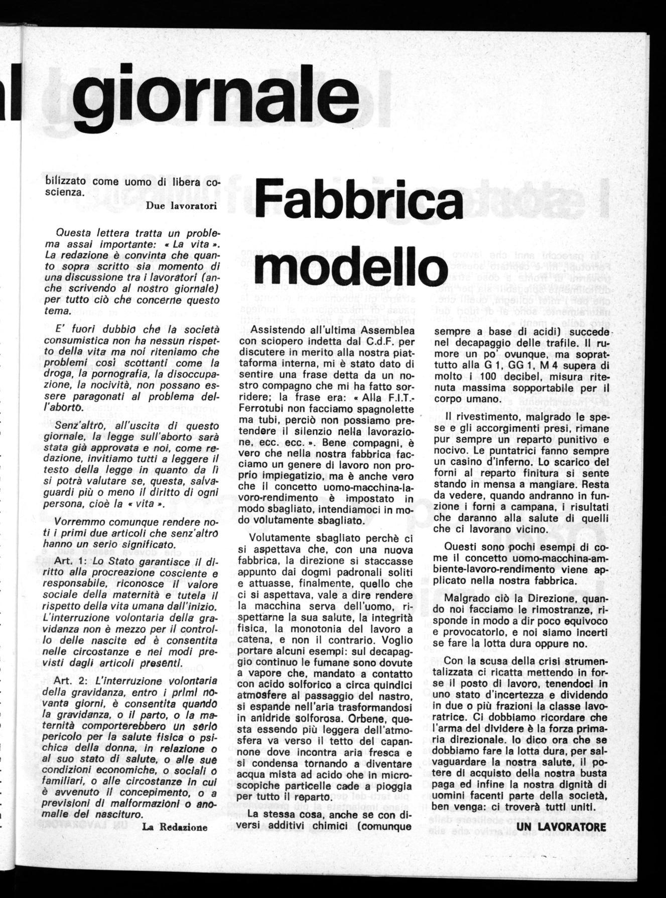 Assistendo all'ultima Assemblea con sciopero indetta dal C.d.F. per discutere in merito alla nostra piattaforma interna, mi è stato dato di sentire una frase detta da un nostro compagno che mi ha fatto sorridere; la frase era: » Alla F.I.T.Ferrotubi non facciamo spagnolette ma tubi, perciò non possiamo pretendere il silenzio nella lavorazione, ecc. ecc. ». Bene compagni, è vero che nella nostra fabbrica facciamo un genere di lavoro non proprio impiegatizio, ma è anche vero che il concetto uomo-macchina-lavoro-rendimento è impostato in modo sbagliato, intendiamoci in modo volutamente sbagliato.