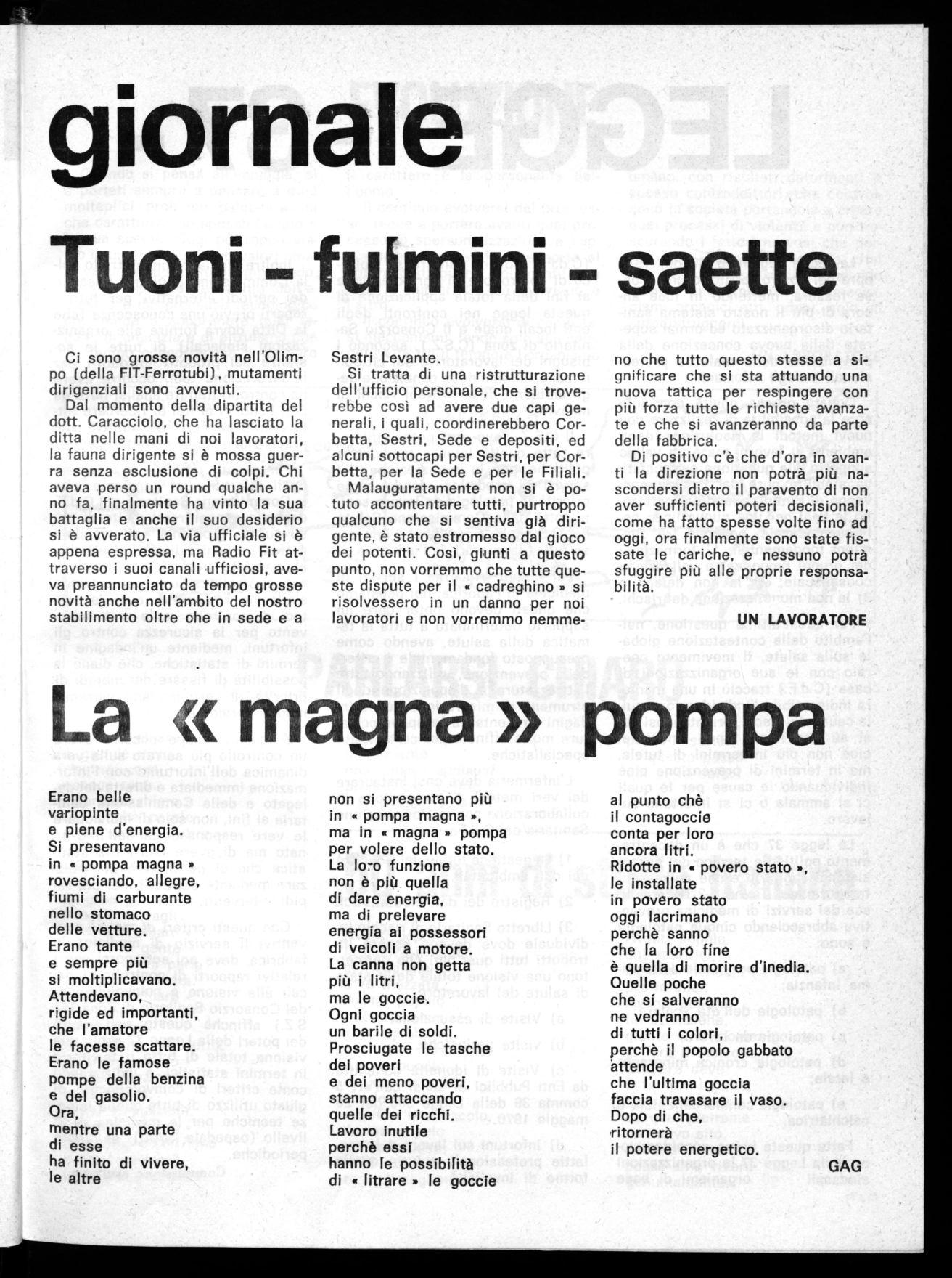 Malauguratamente non si è potuto accontentare tutti, purtroppo qualcuno che si sentiva già dirigente, è stato estromesso dal gioco dei potenti. Così, giunti a questo punto, non vorremmo che tutte queste dispute per il « cadreghino » si risolvessero in un danno per noi lavoratori e non vorremmo nemme-