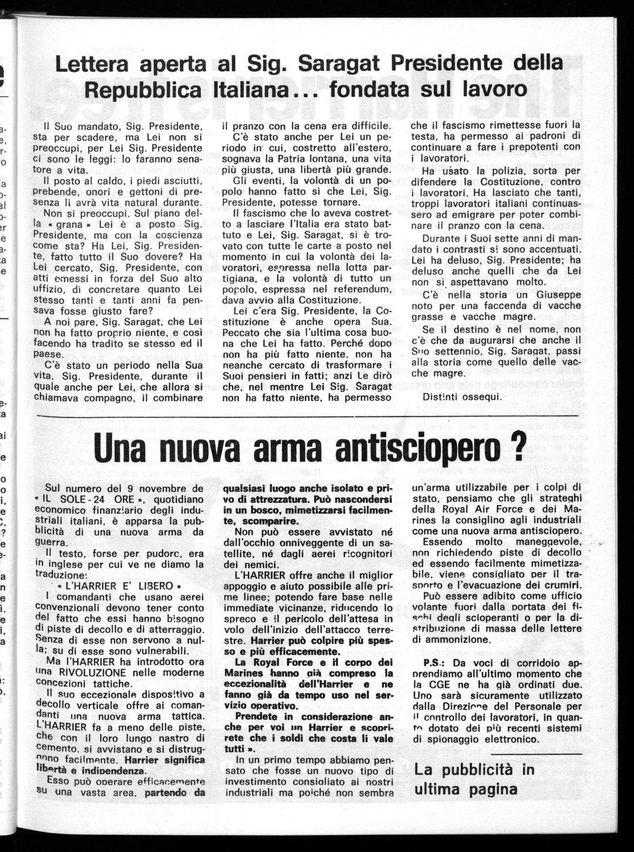 P.S.: Da voci di corridoio apprendiamo all'ultimo momento che la CGE ne ha già ordinati due. Uno sarà sicuramente utilizzato dalla Direzio"e del Personale per il controllo dei lavoratori, in quant^ dotato dei più recenti sistemi di spionaggio elettronico.