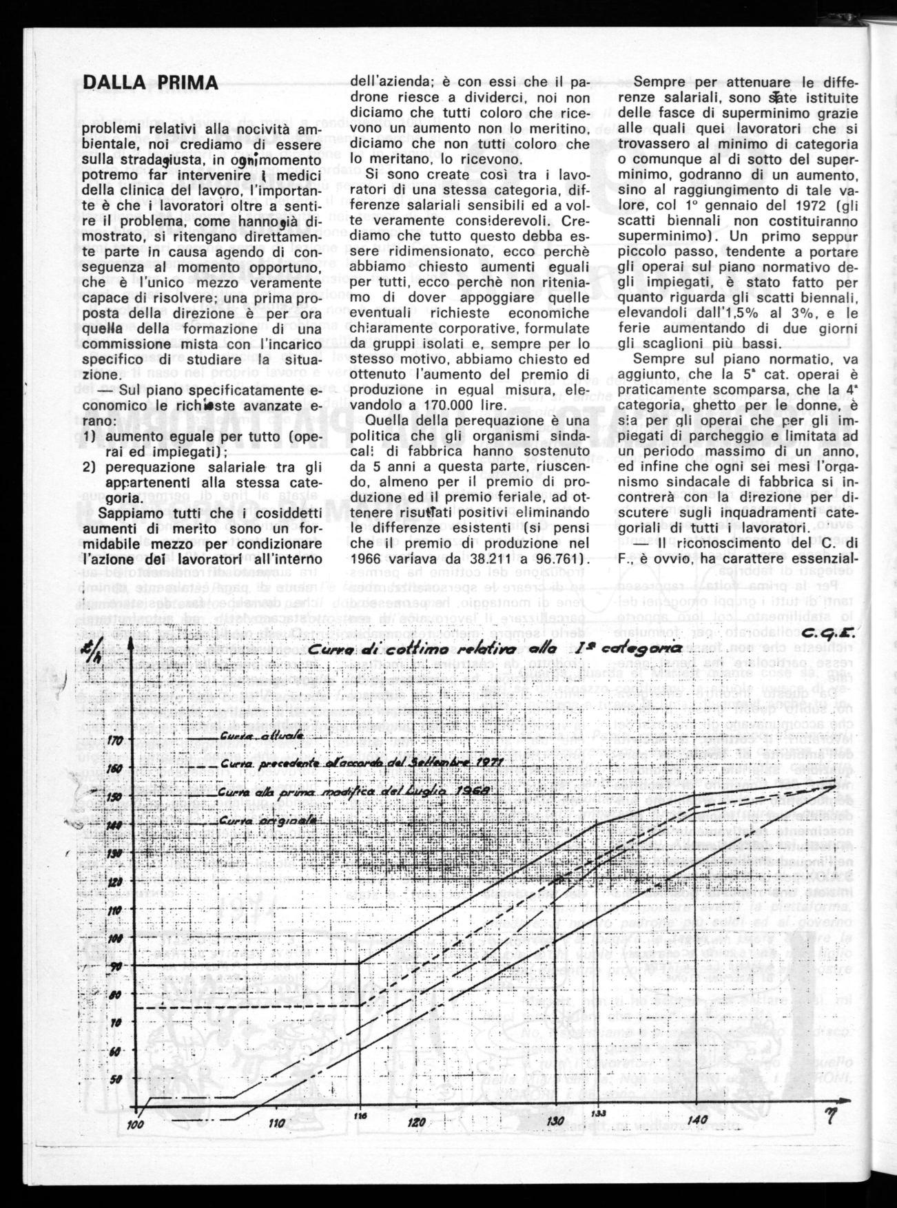 -- Cottimo: il lavoro ad incentivo è il tipico mezzo col quale il padrone sfrutta il lavotatore; l'introduzione del cottimo ha permesso di creare le spersonalizzanti catene di montaggio, ha permesso di parcellizzare il lavoro cioè di renderlo sempre meno responsabile ed interessante suddividendo il prodotto da costruire in mot'tissime operazioni, ha permesso in definitiva di produrre di più auto sollecitando il lavoratore attraverso la visione di un maggior guadagno, che tra l'altro non è mai stato proporzionale alla maggior produzione effettiva. II diagramma che fa se.nito dimostra come si è riusciti ad attenuare l'incentivazione, le varie linee indicano le curve dà cottimo precedenti all'ultimo accordo.