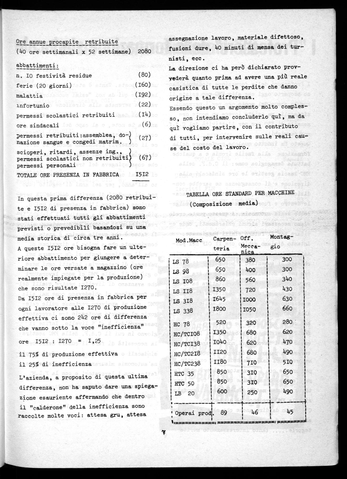 Da 1512 ore di presenza in fabbrica per ogni lavoratore alle 1270 di produzione effettiva ci sono 242 ore di differenza che vanno sotto la voce "inefficienza"